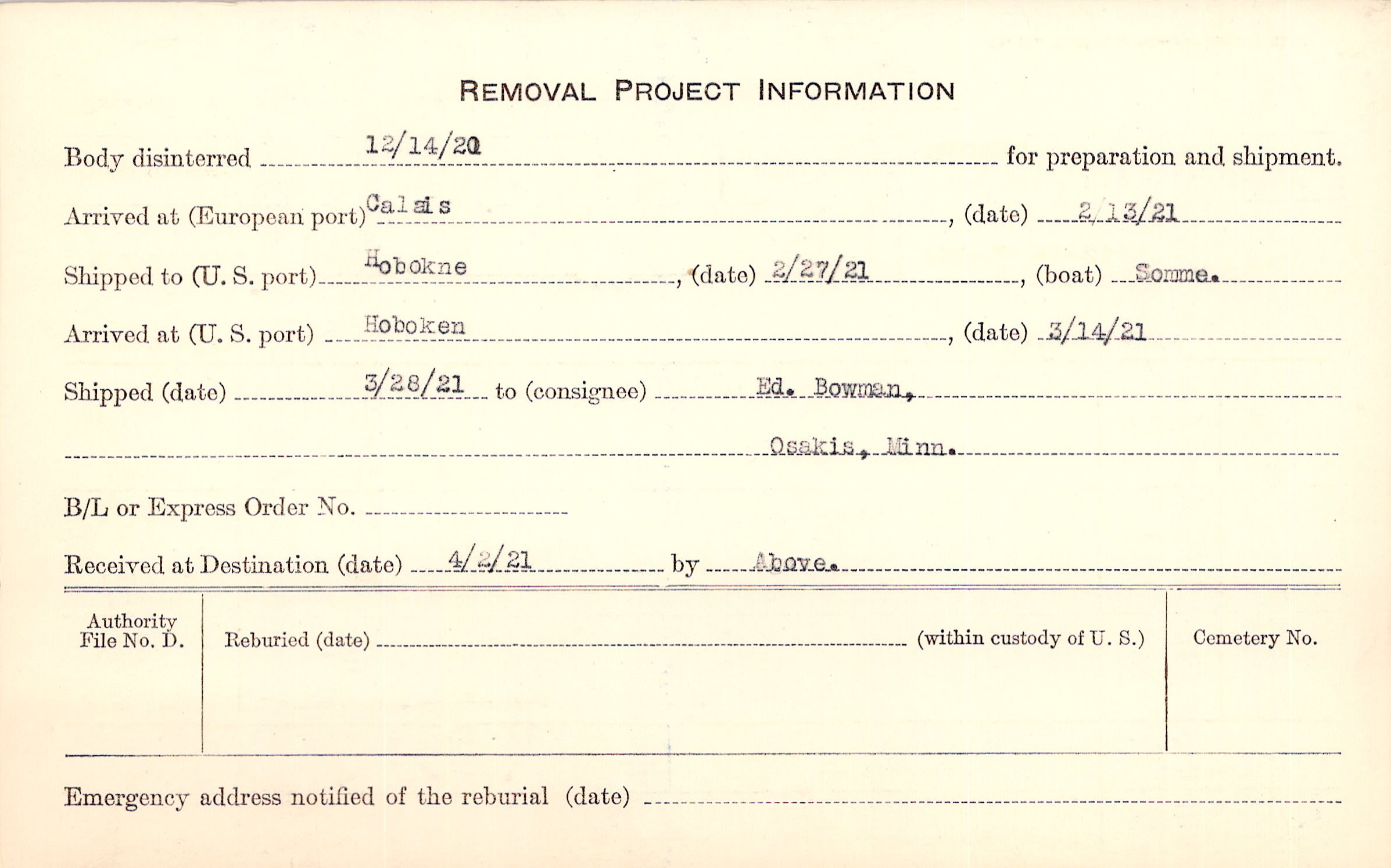 Body disinterred 12/14/1920 for preparation and shipment.