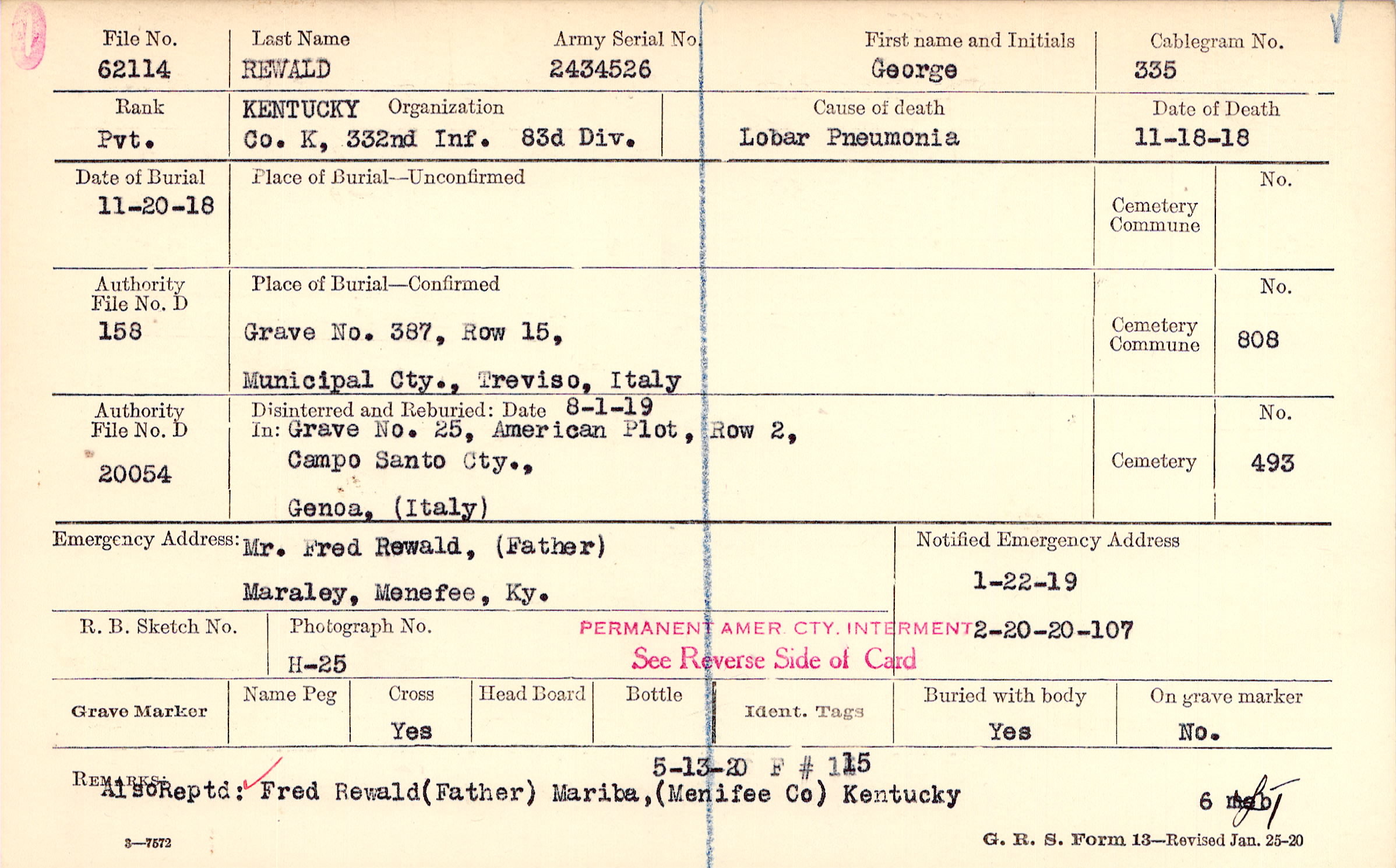 Mr. Fred Rewald, (Father), Maraley, Menefee, Ky., Also Reptd: Fred Rewald (Father) Mariba, (Menifee Co) Kentucky