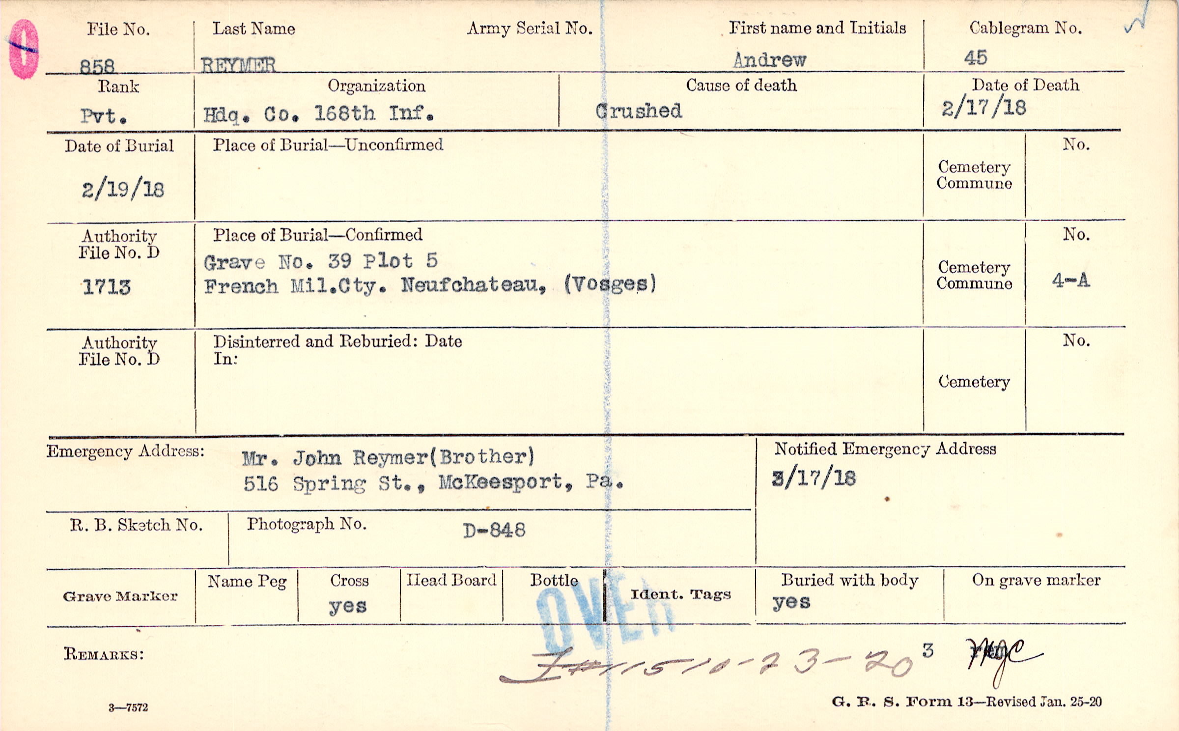 Mr. John Reymer (Brother), 516 Spring St., McKeesport, Pa.