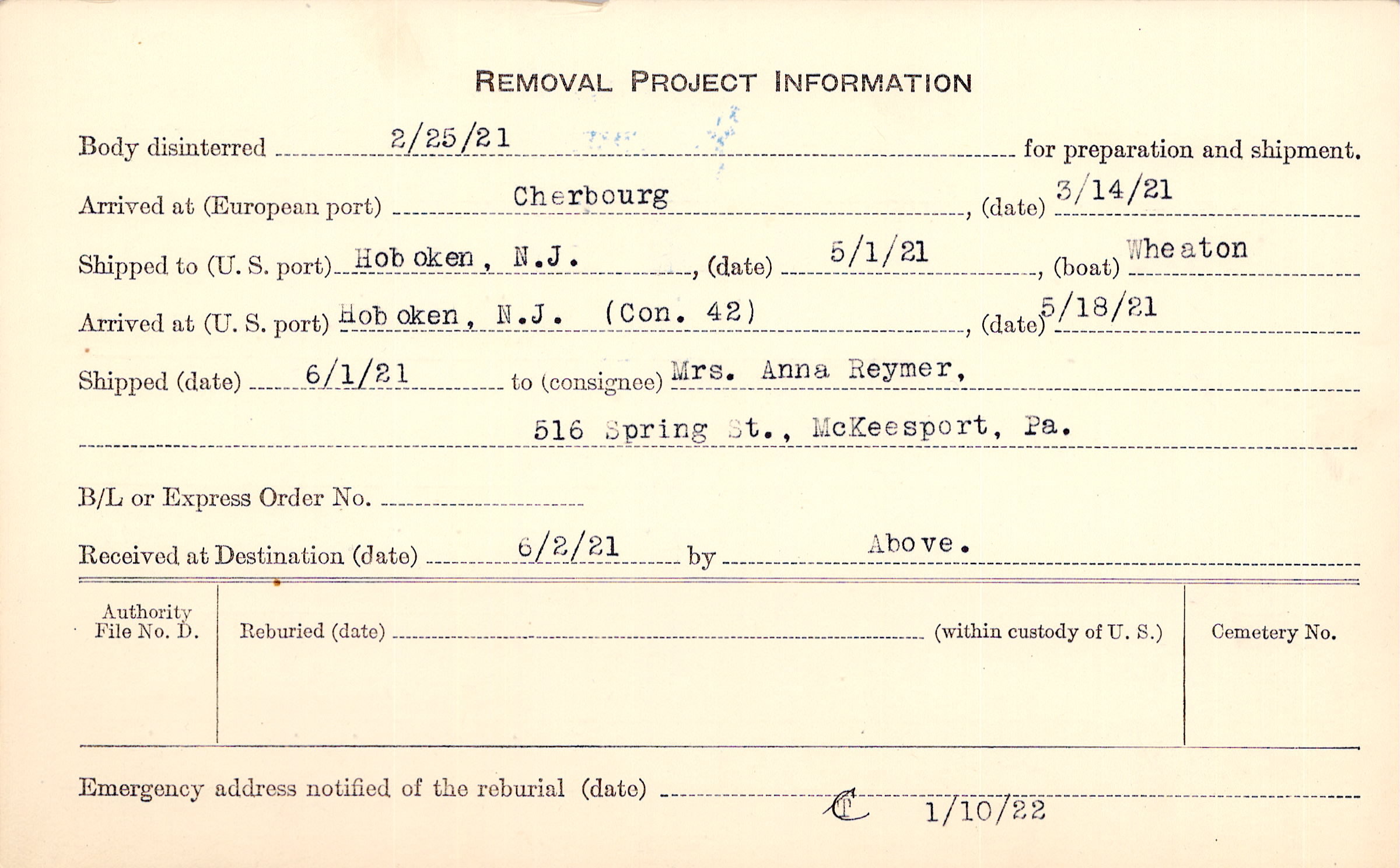 Body disinterred 2/25/1921 for preparation and shipment.