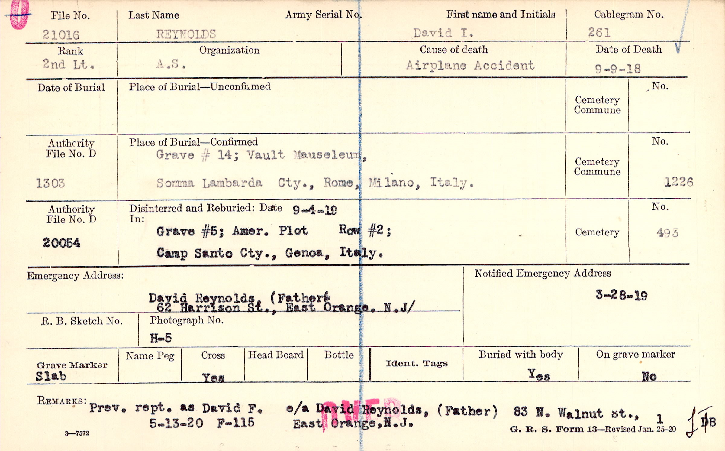 Prev. rept. as David F. e/a David Reynolds, (Father) 83 N. Walnut St., East Orange, N.J., 5-13-20 F-115