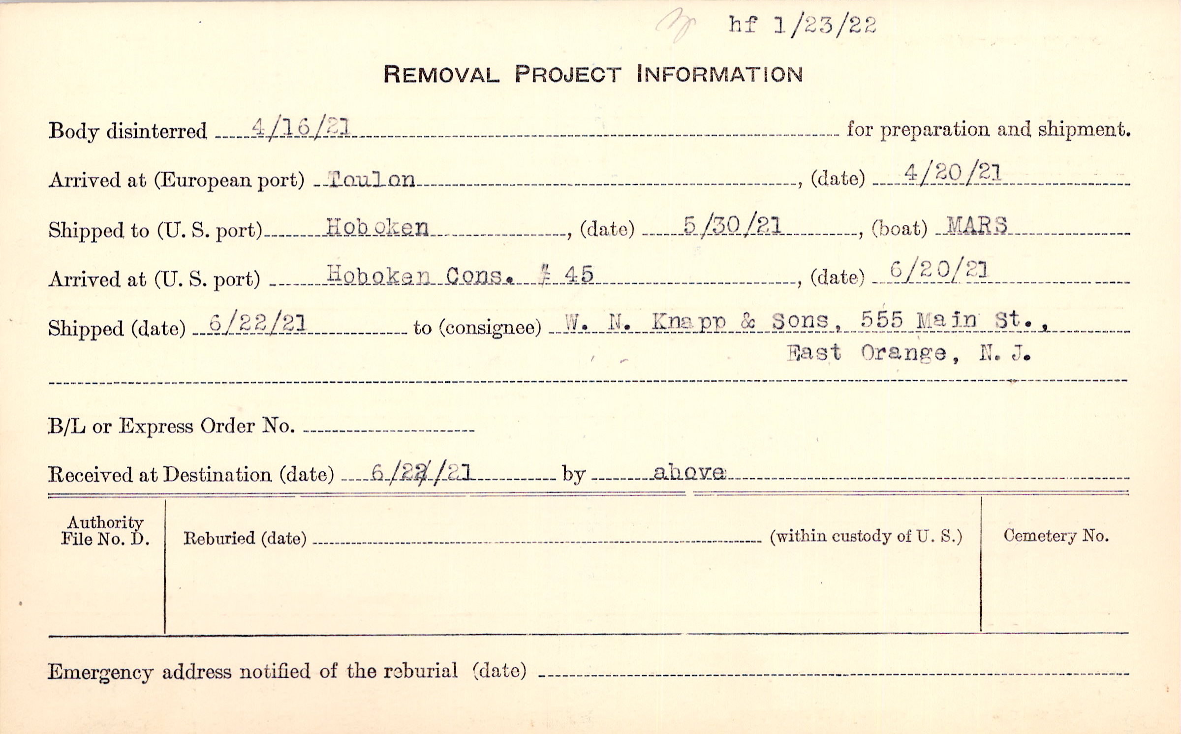 Body disinterred 4/16/1921 for preparation and shipment.
