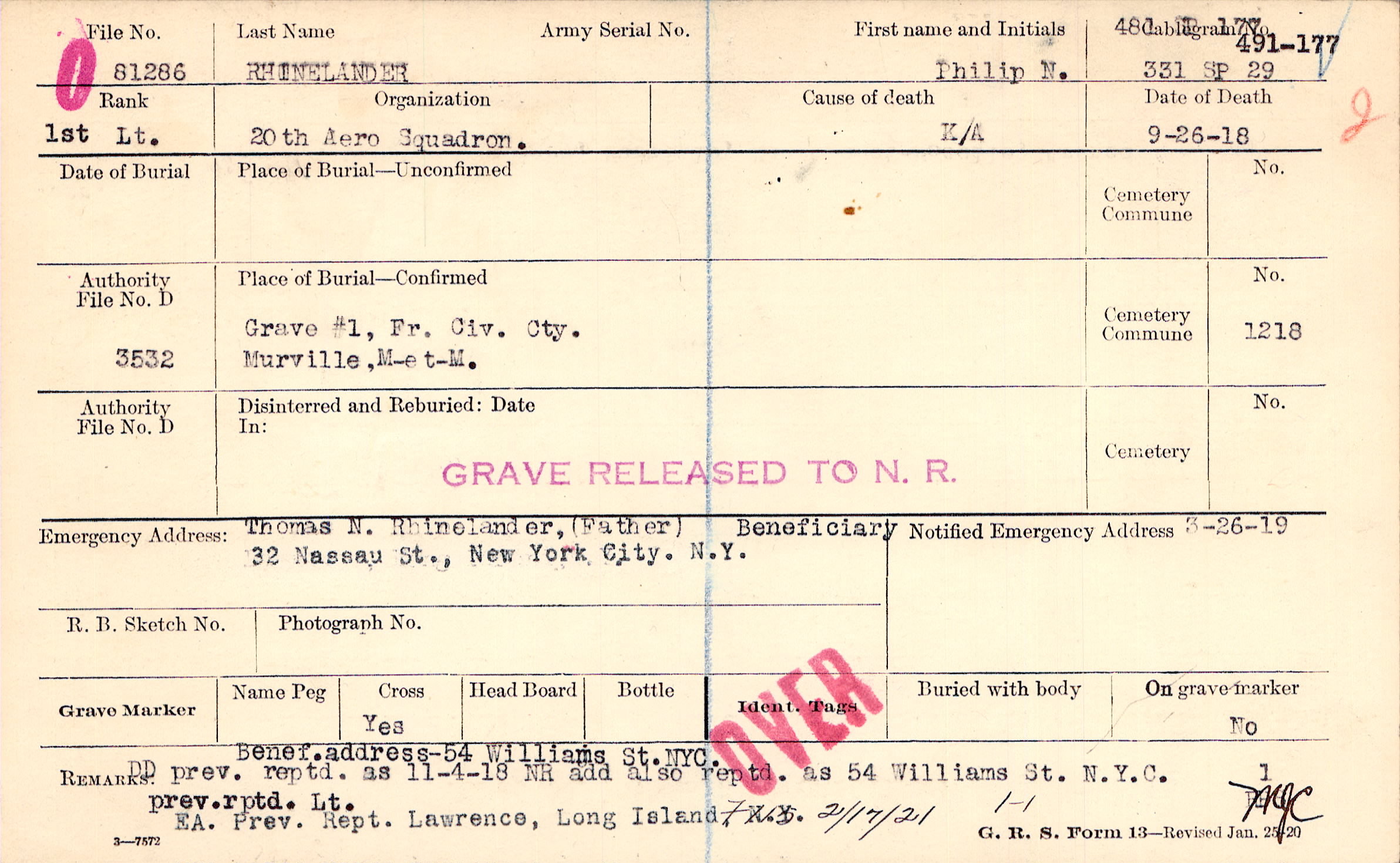 Thomas N. Rhinelander, (Father) Beneficiary, 32 Nassau St., New York City. N.Y.