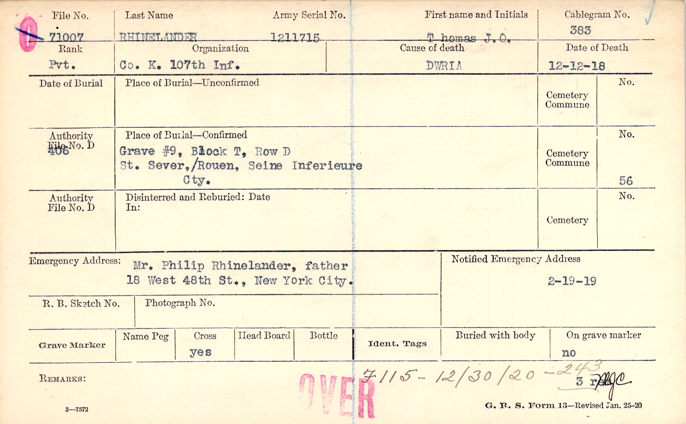 Grave #9, Block T, Row D, St. Sever/ Rouen, Seine Inferieure, Cty.,