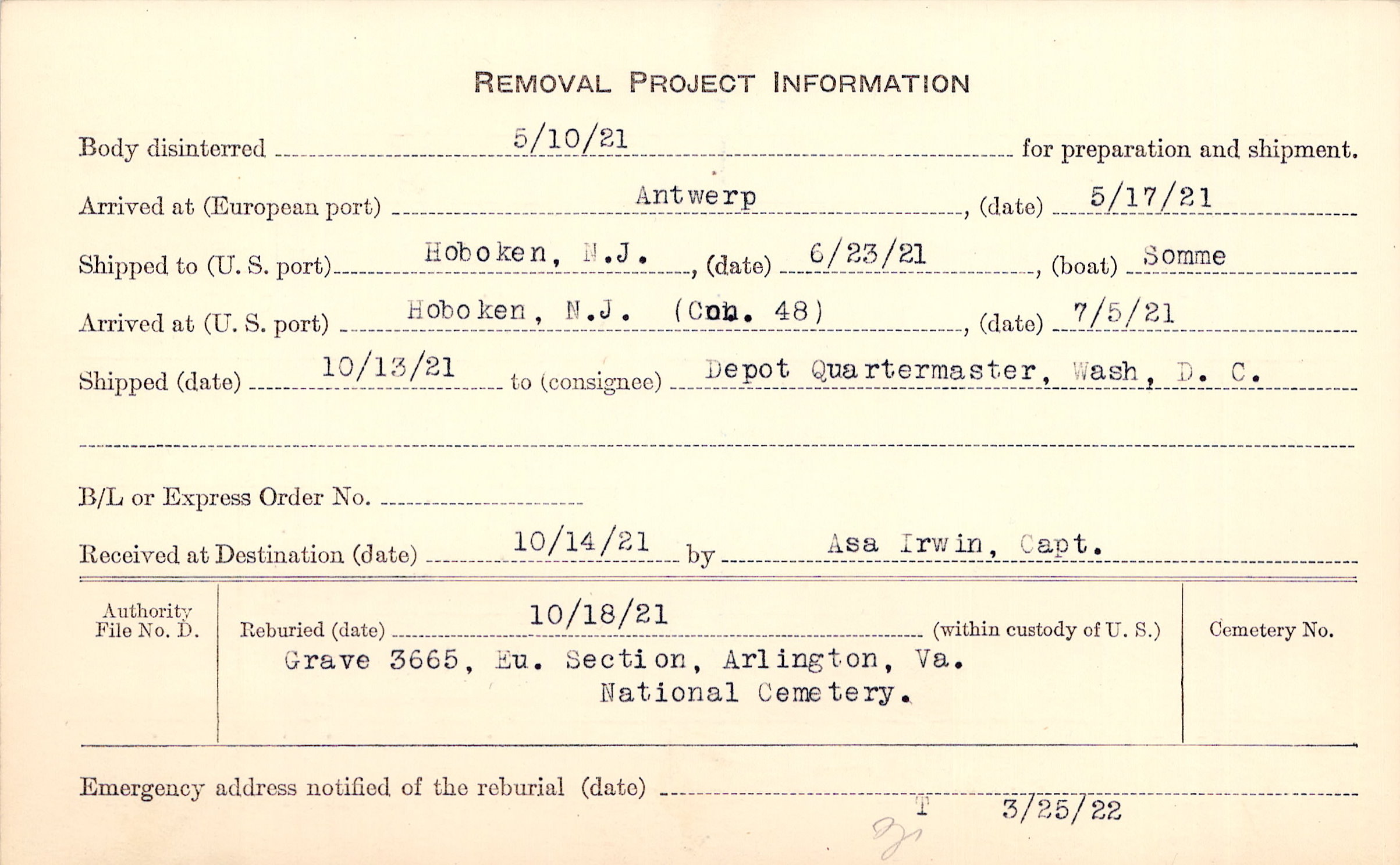 Body disinterred 5/10/1921 for preparation and shipment.