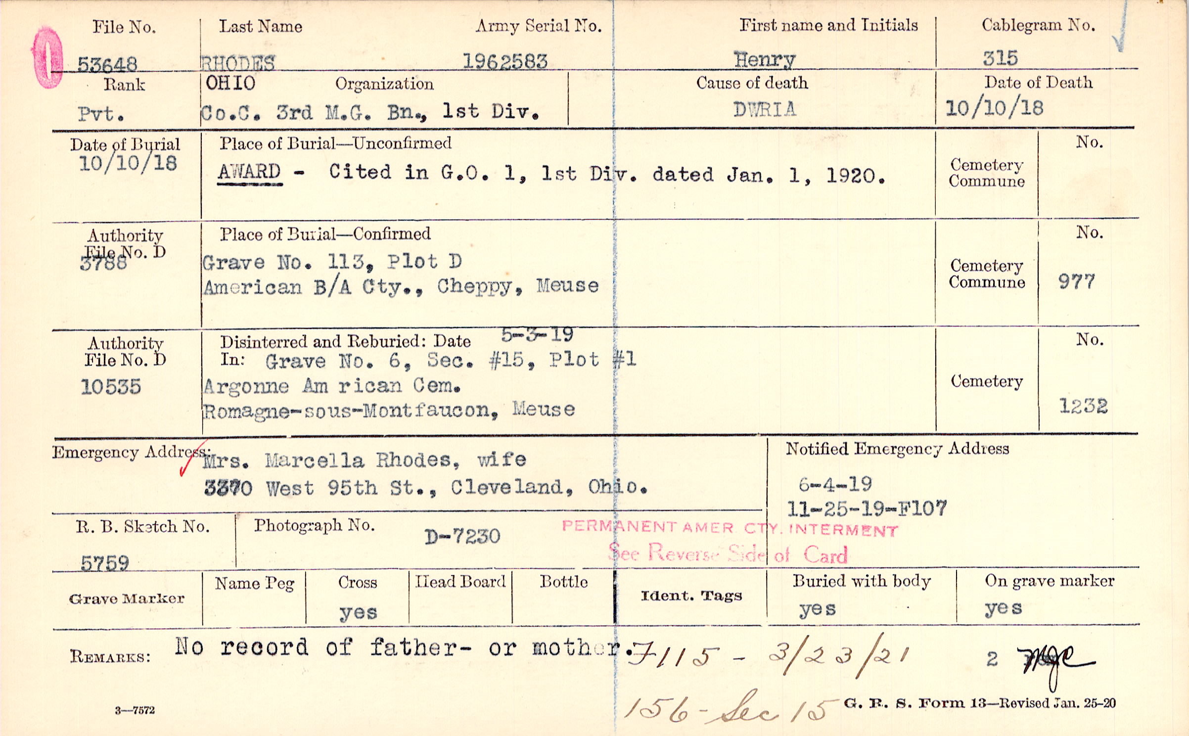 Mrs. Marcella Rhodes, wife, 3370 West 95th St., Cleveland, Ohio.