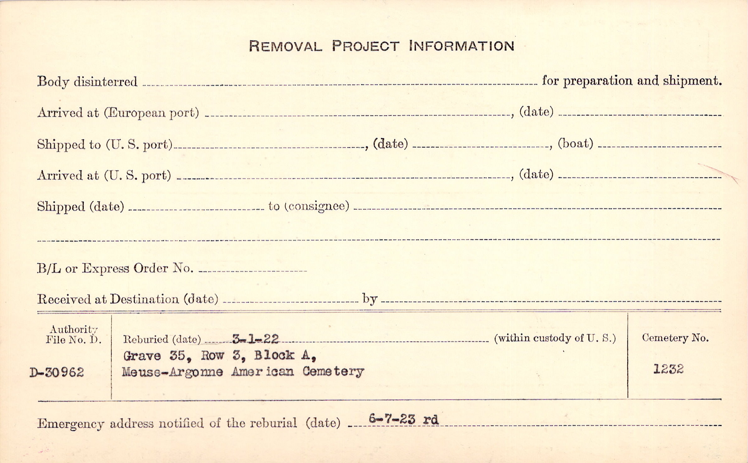 | Permanent Burial in Foreign Cemetery |