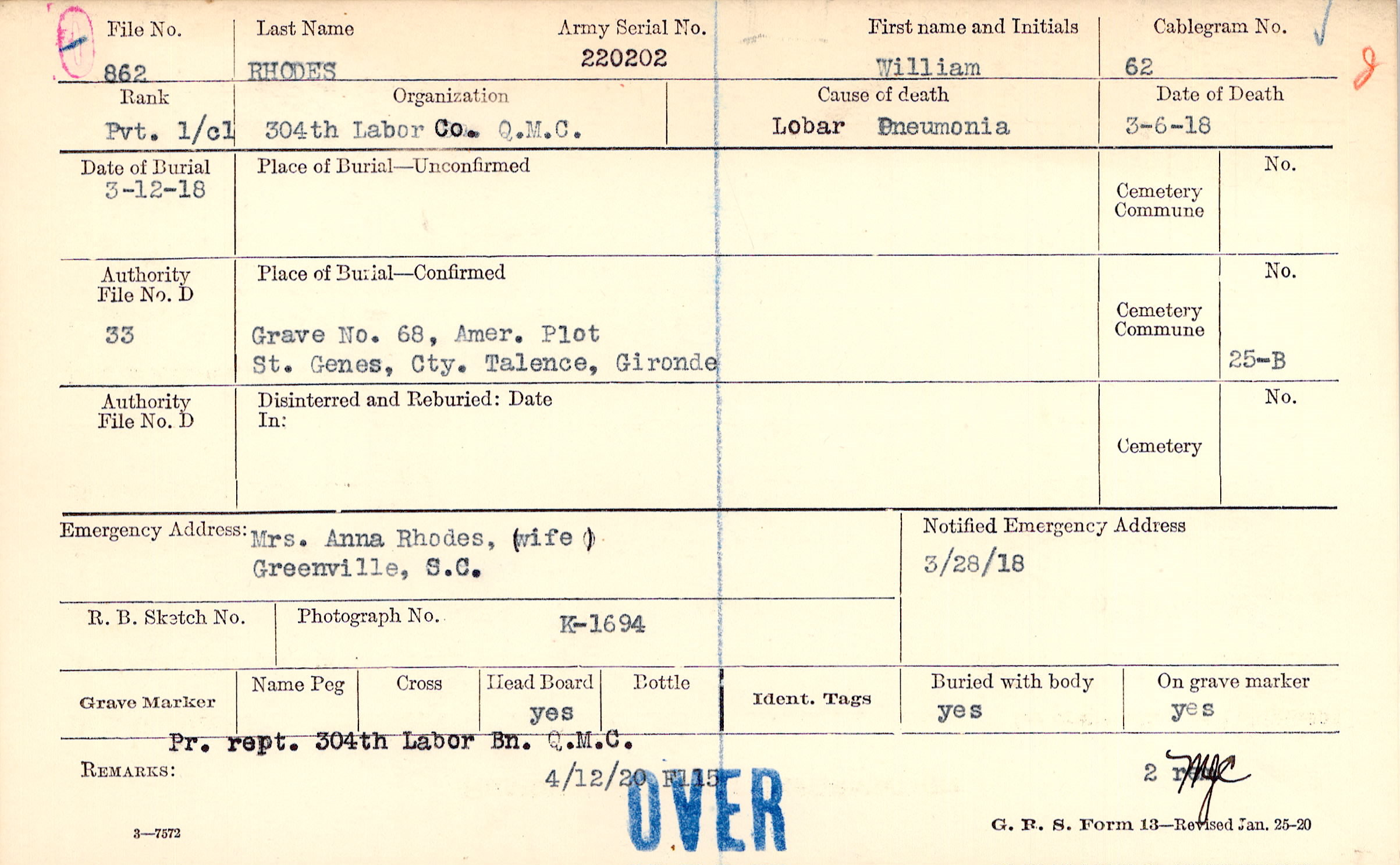 Grave 68, Amer. Plot, St. Genes, Cty., Talence, Gironde