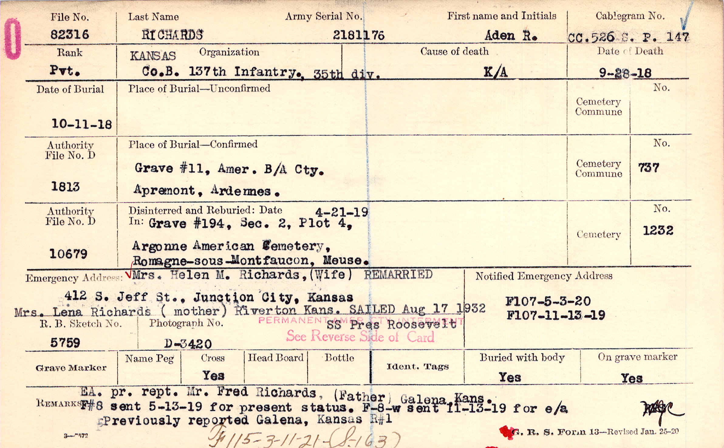 Mrs. Helen M. Richards, (Wife), 412 S. Jeff St., Junction City, Kansas, REMARRIED Mrs. Lena Richards (mother) Riverton Kans. SAILED Aug. 17 1932 SS Pres Roosevelt