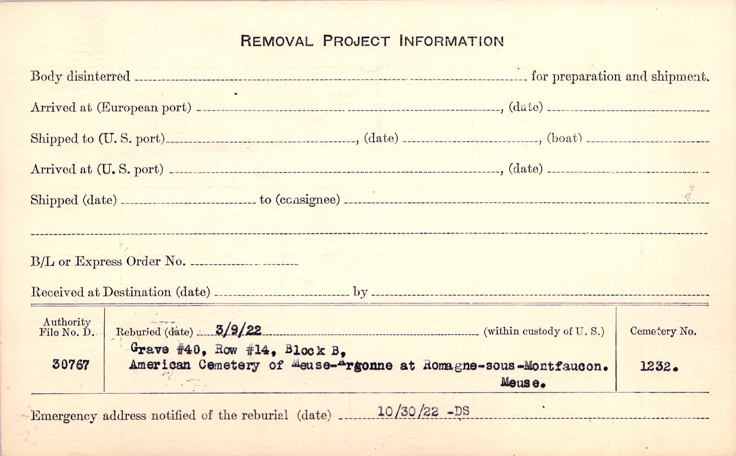 | Permanent Burial in Foreign Cemetery |