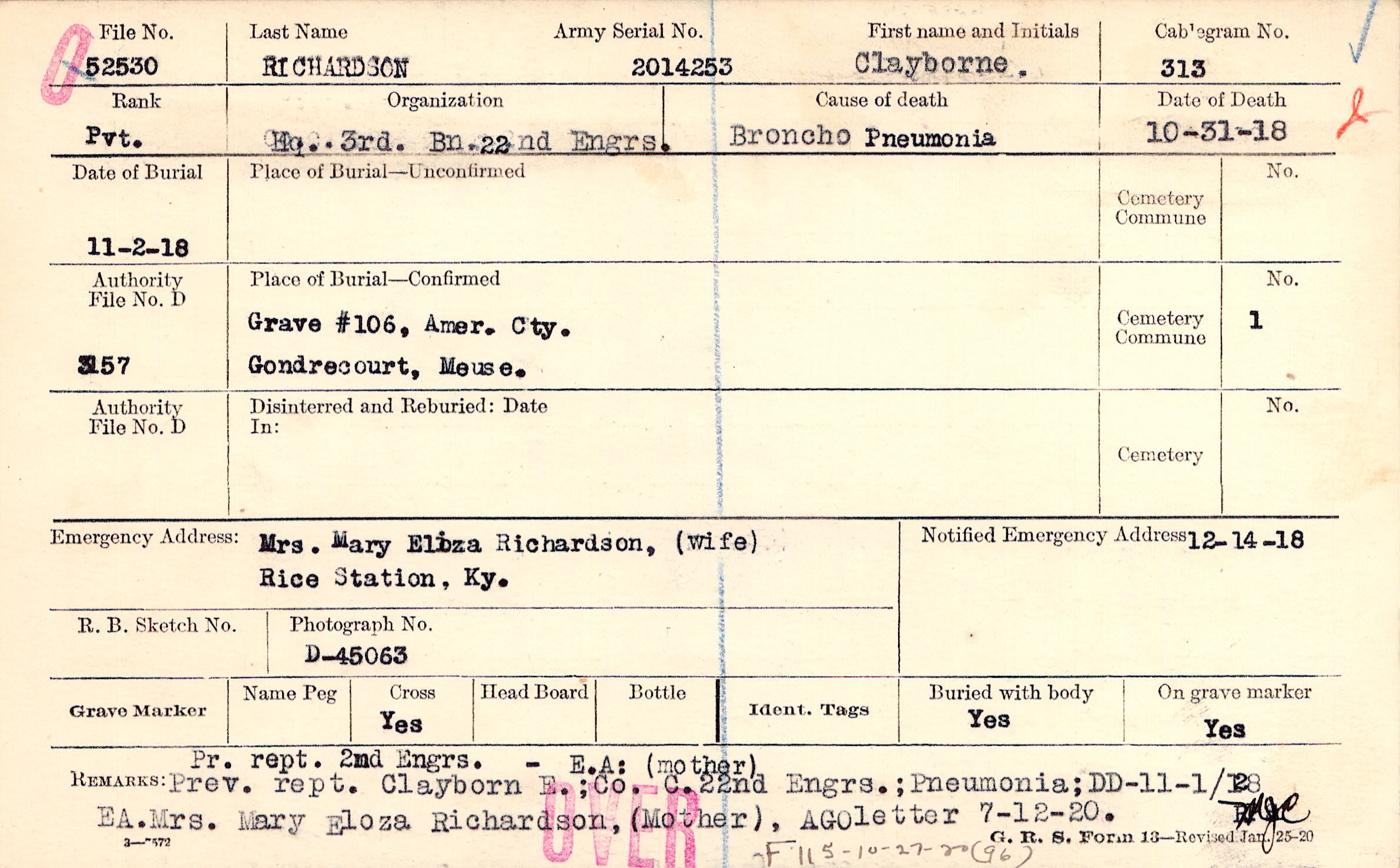 Pr. rept. 2nd Engrs. - E.A: (Mother) Prev. rept. Clayborn E.; Co. C. 22nd Engrs.; Pneumonia; DD-11-1/18 EA. Mrs. Mary Eloza Richardson, (Mother), AGO letter 7-12-20., F115-10-27-20 (96)