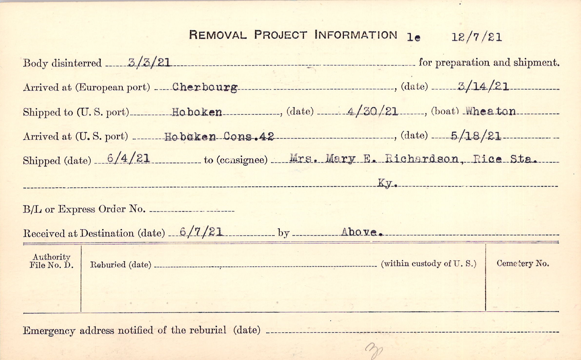 Body disinterred 3/3/1921 for preparation and shipment.