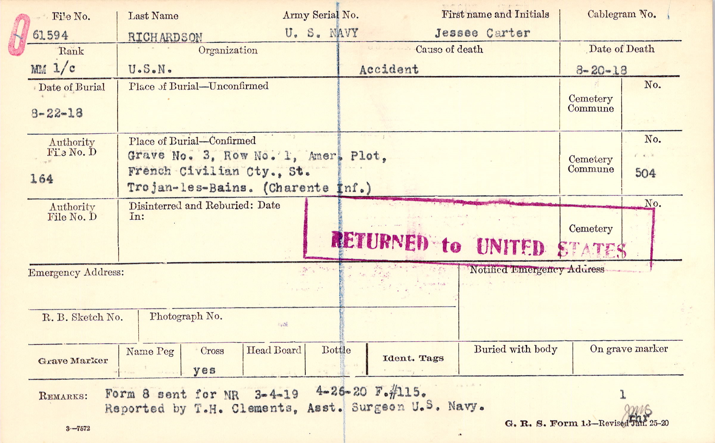 Reported by T.H. Clements, Asst. Surgeon U.S. Navy., Form 8 sent for NR 3-4-19, 4-26-20 F.#115