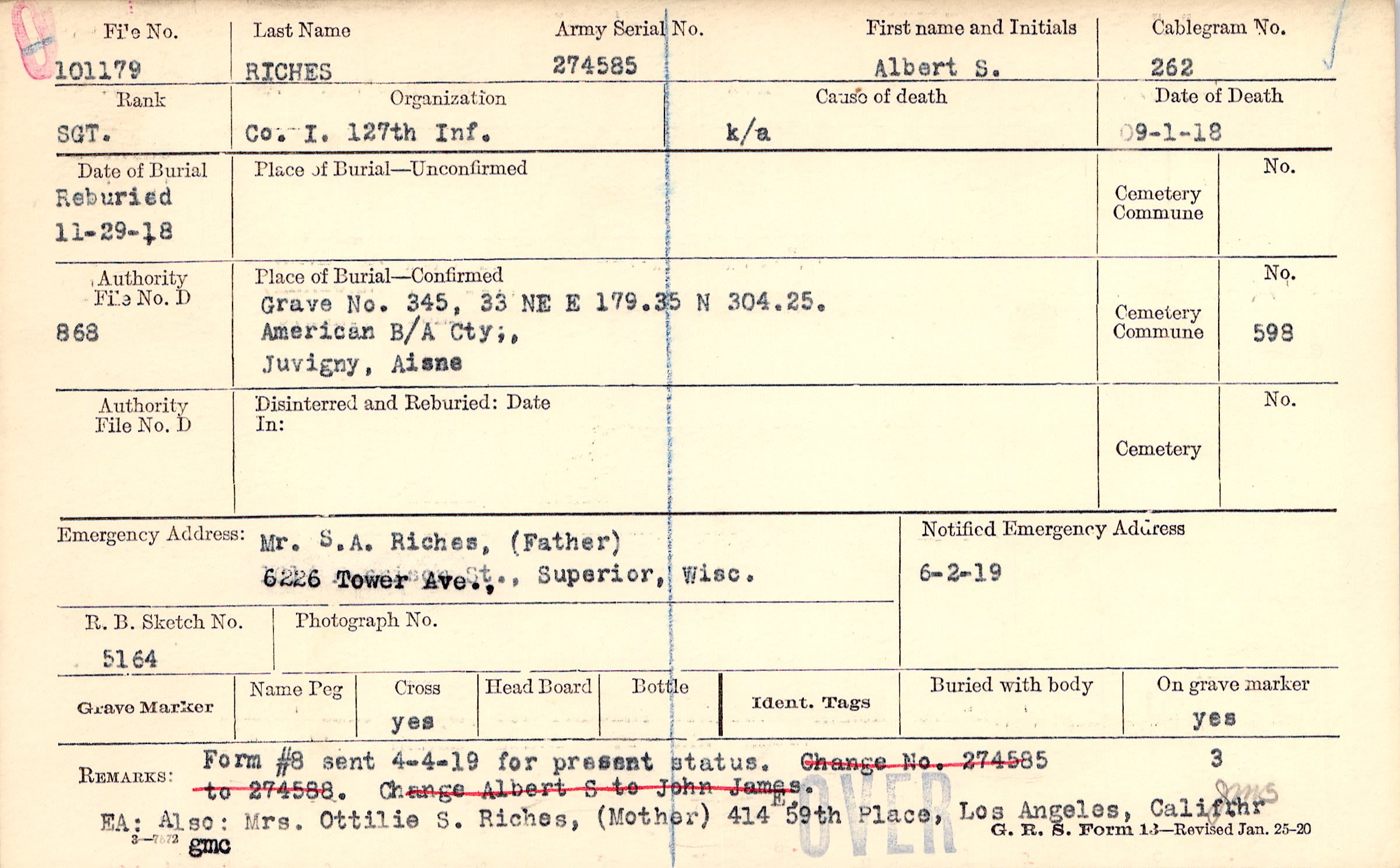 Change No. 274585 to 274588. Change Albert S. to John James. EA: Also: Mrs. Ottilie S. Riches, (Mother) 414 59th Place, Lost Angeles, California gmc, Form #8 sent 4-4-19 for present status.