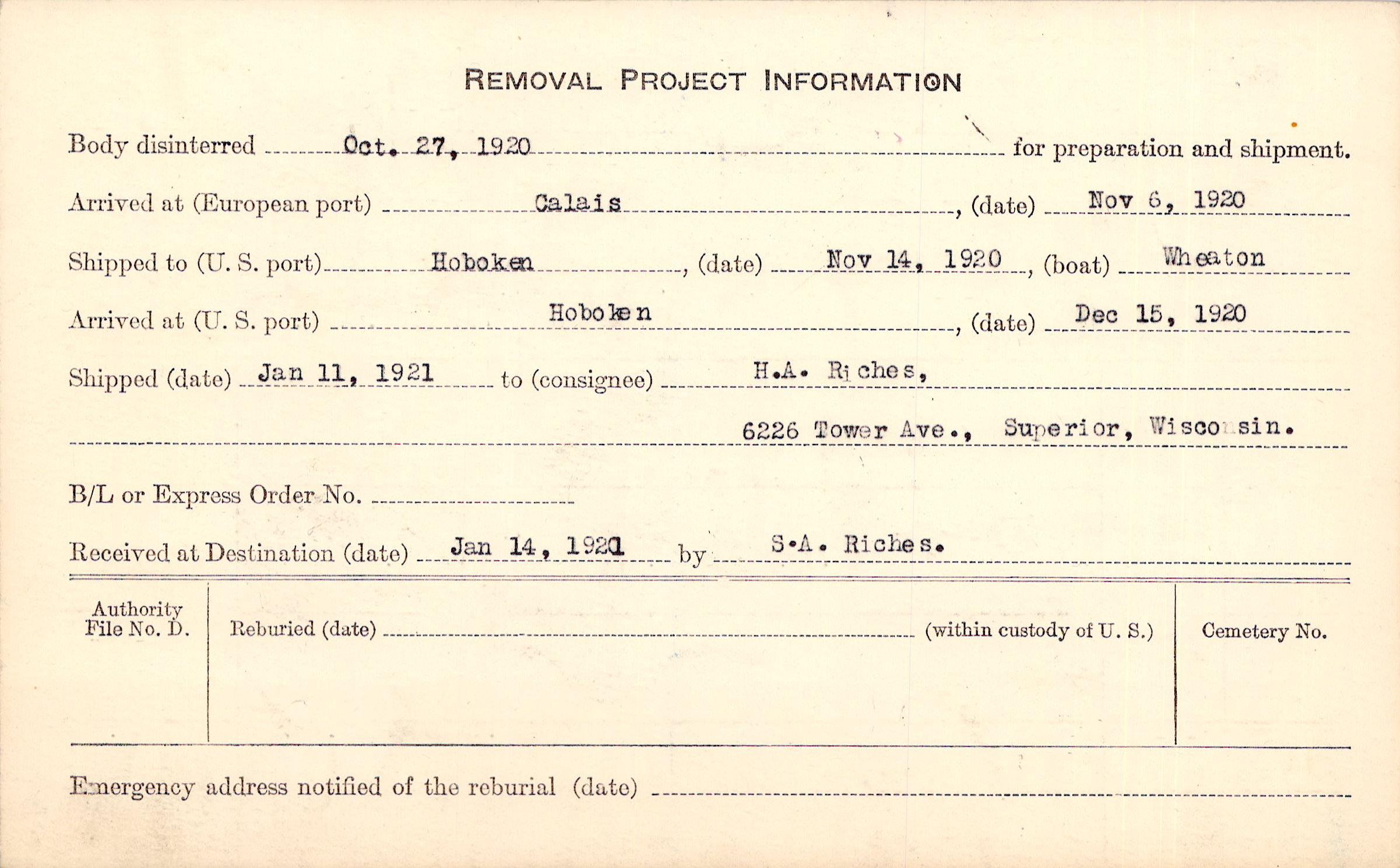Mr. S.A. Riches, (Father), 6226 Tower Ave., Superior, Wisc.