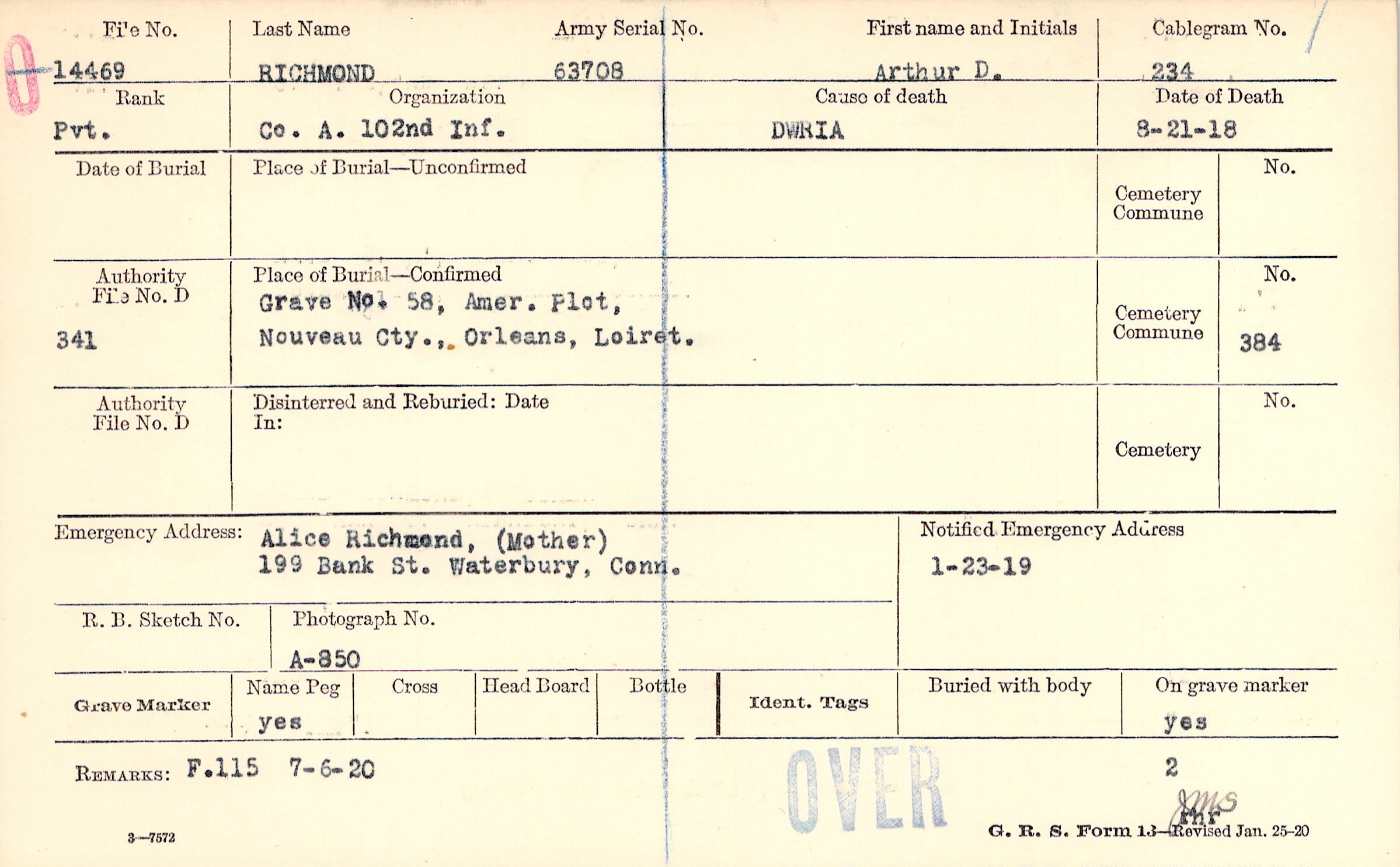 Alice Richmond, (Mother), 199 Bank St. Waterbury, Conn.