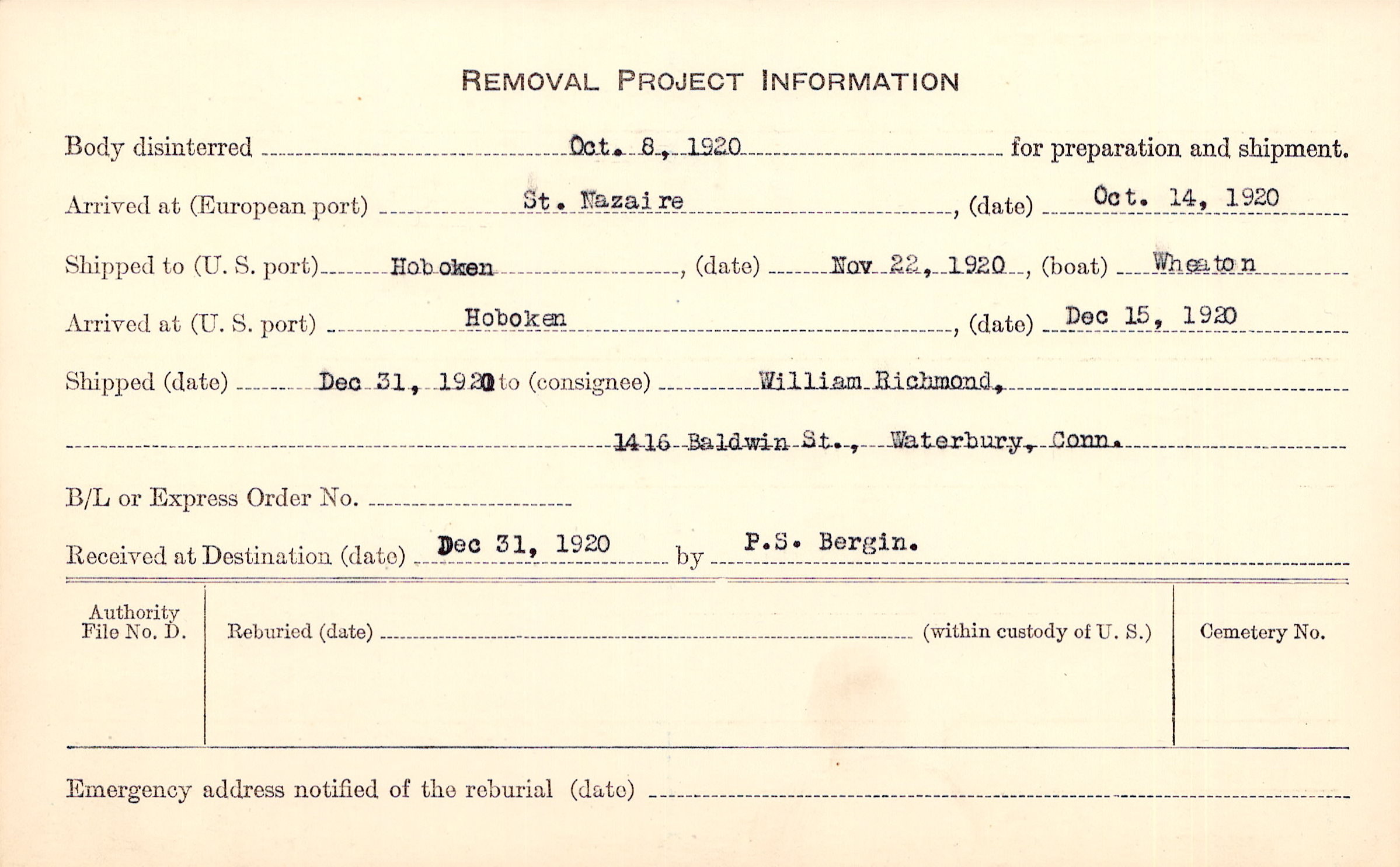Body disinterred 10/8/1920 for preparation and shipment.