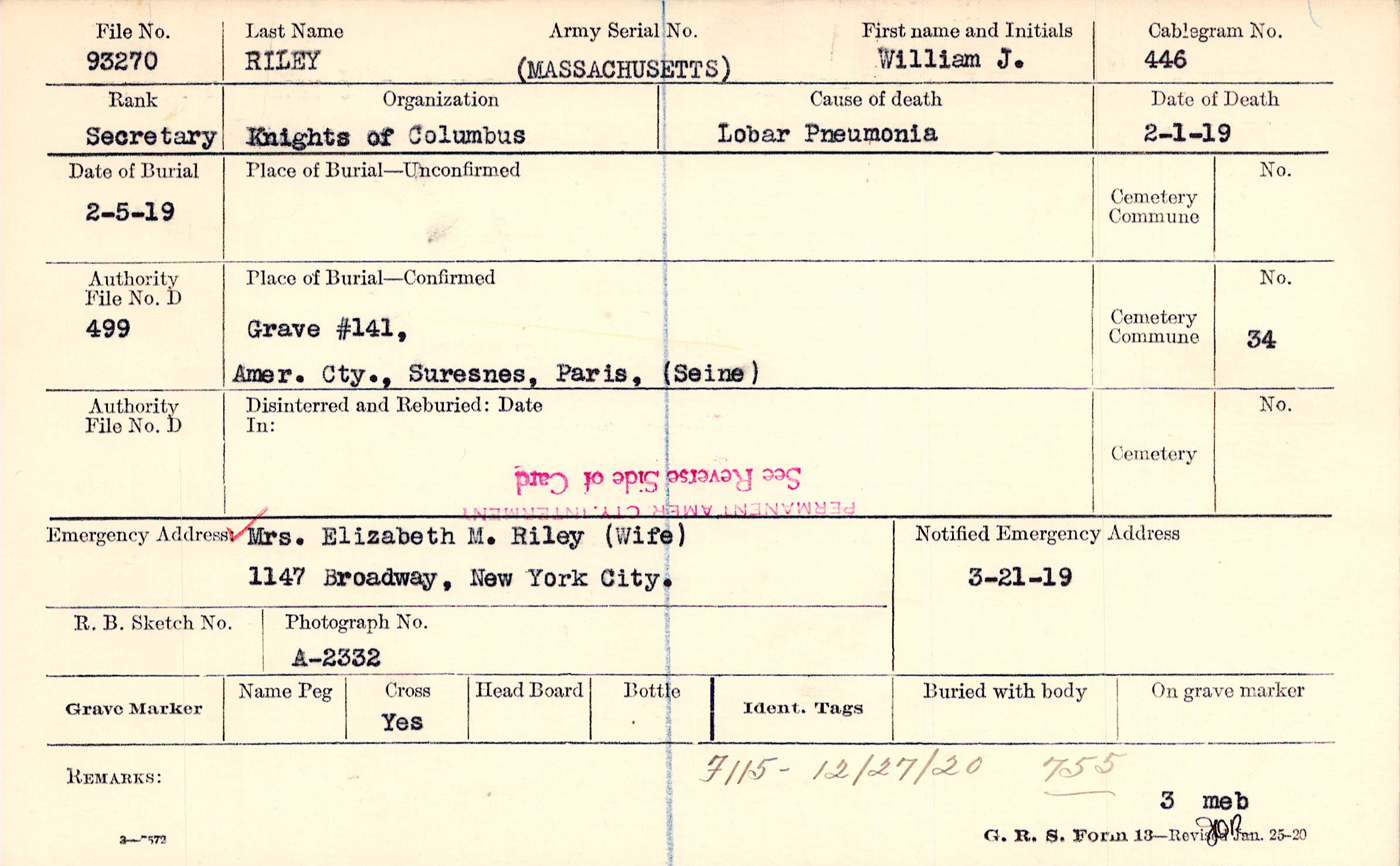 Mrs. Elizabeth M. Riley (Wife), 1147 Broadway, New York City.