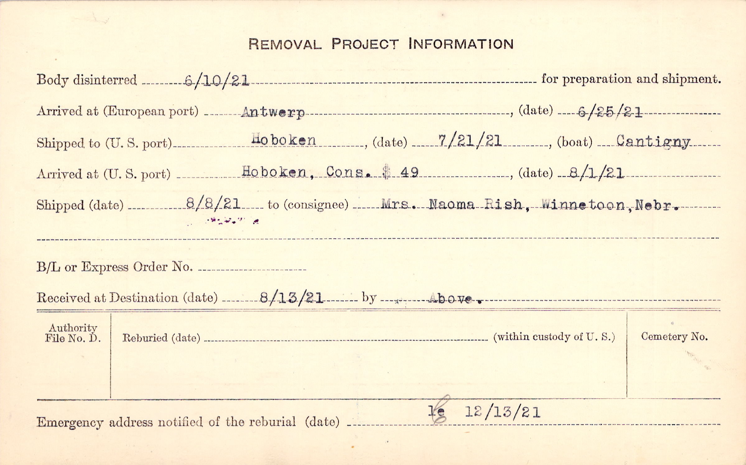 Body disinterred 6/10/1921 for preparation and shipment.