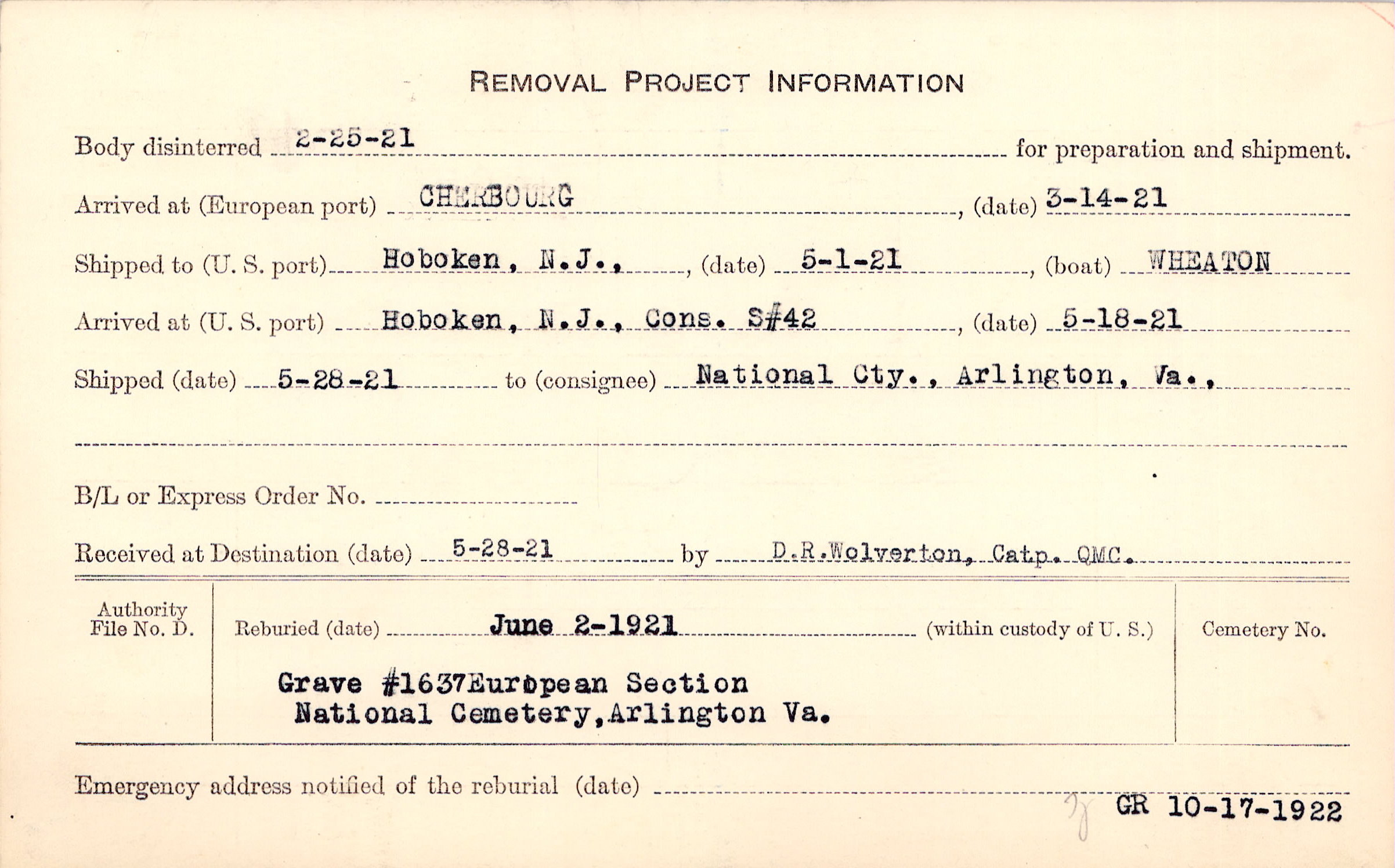 Body disinterred 2/25/1921 for preparation and shipment.