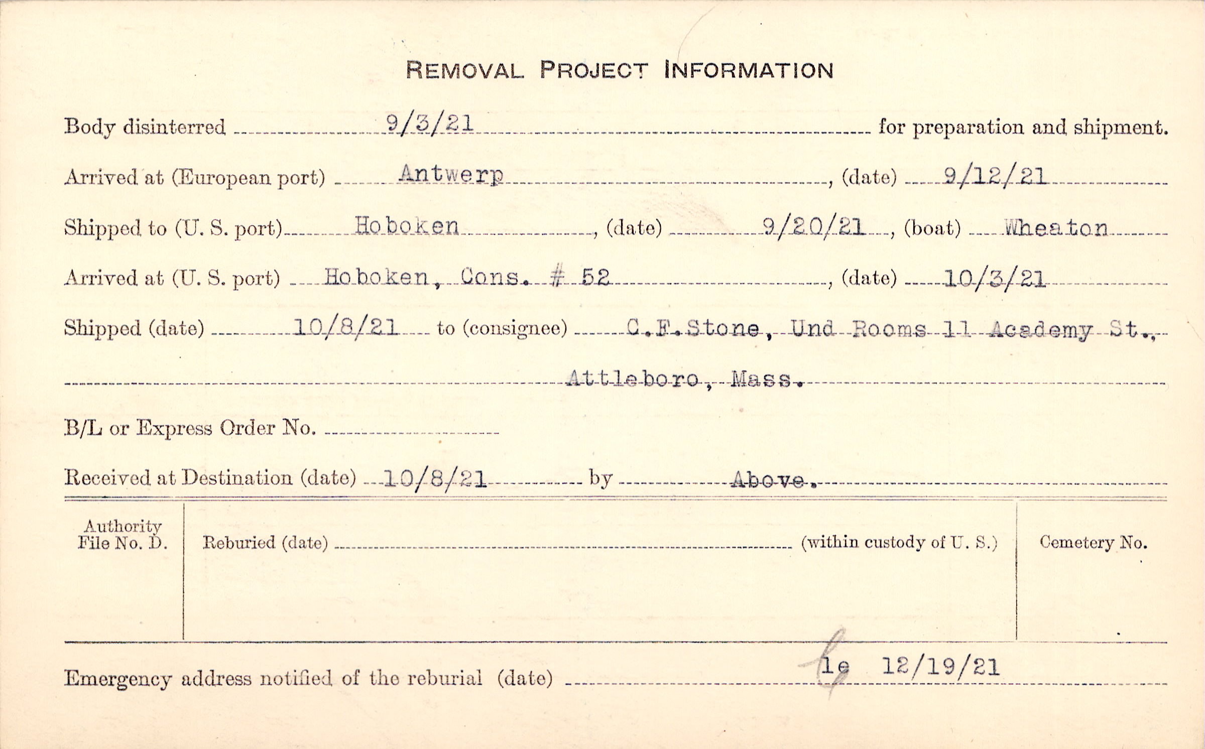 Body disinterred 9/3/1921 for preparation and shipment.
