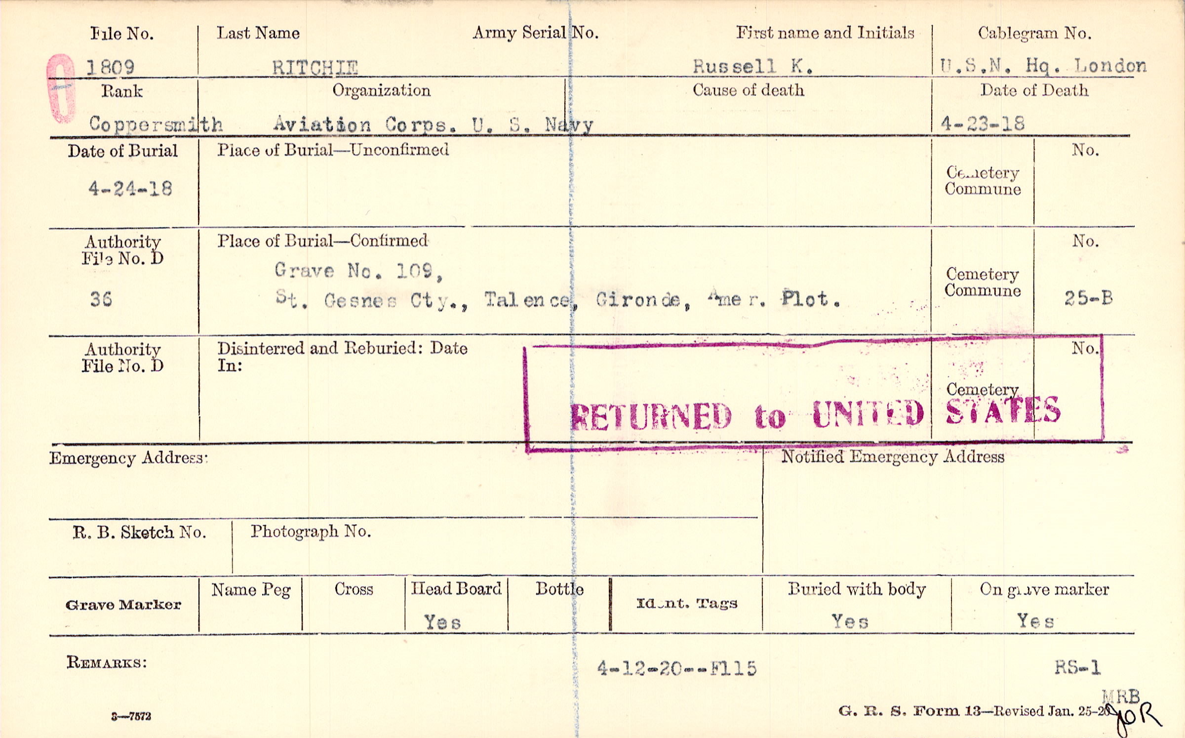 Grave 109,St. Gesnes Cty., talence, Gironde, Amer. Plot.,