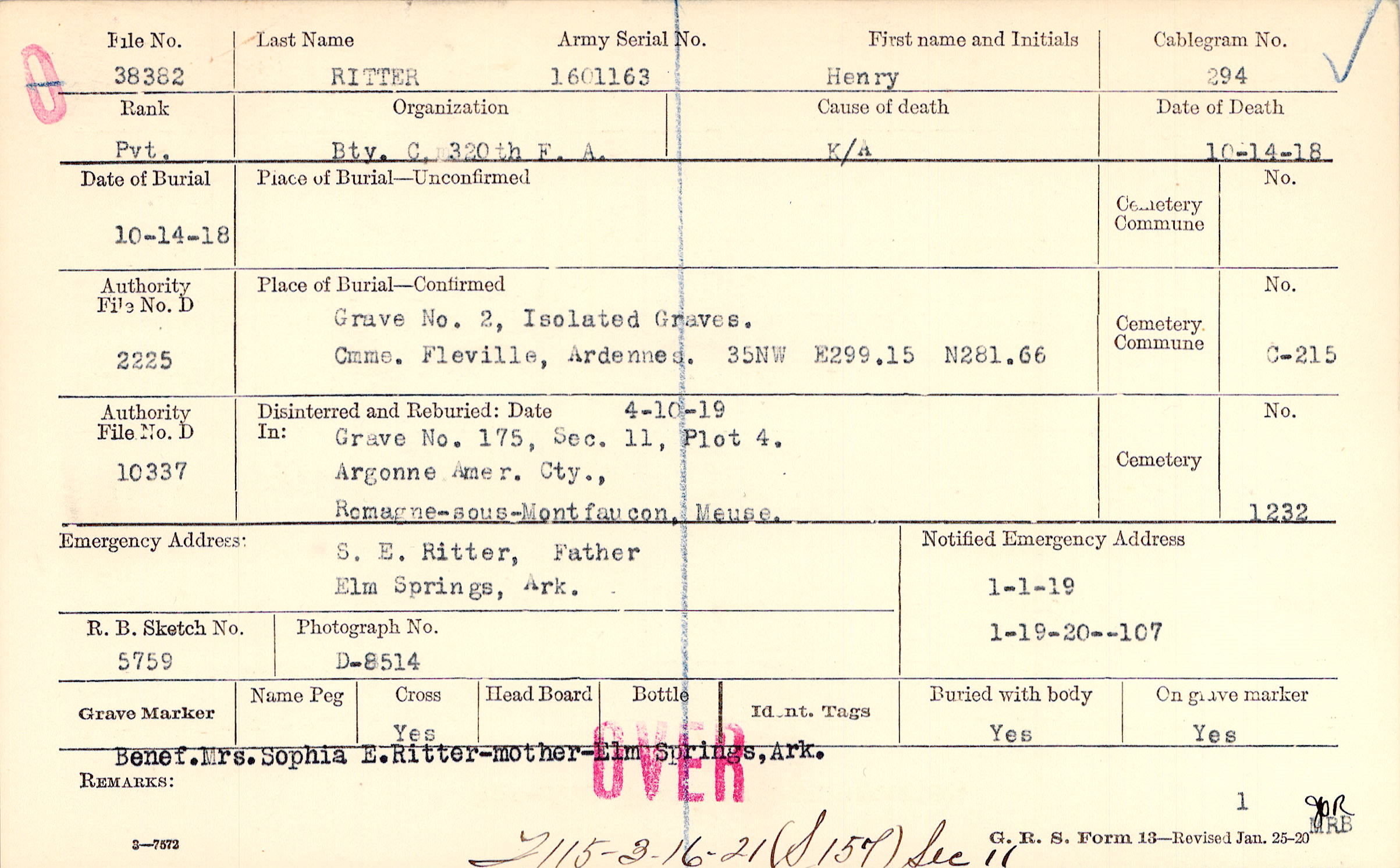 Grave 175, Section 11, Plot 4, Argonne American Cemetery, Romagne-sous-Montfaucon, Meuse