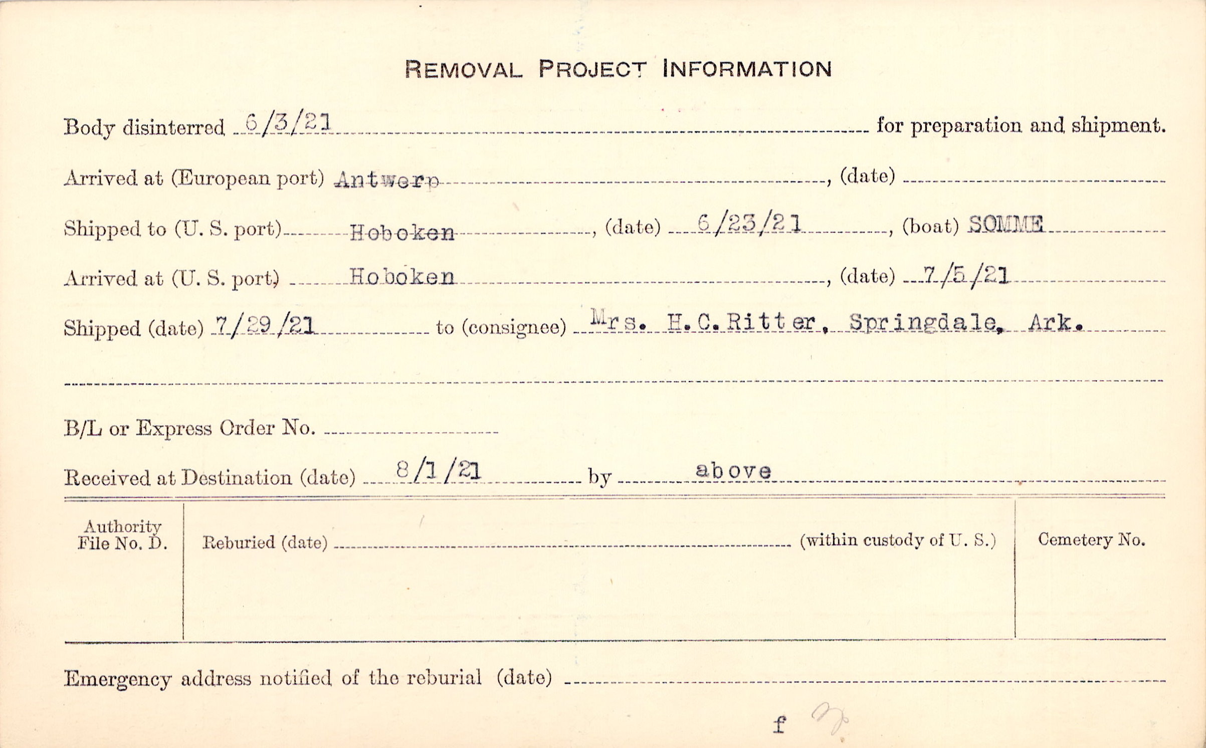 Body disinterred 6/3/1921 for preparation and shipment.