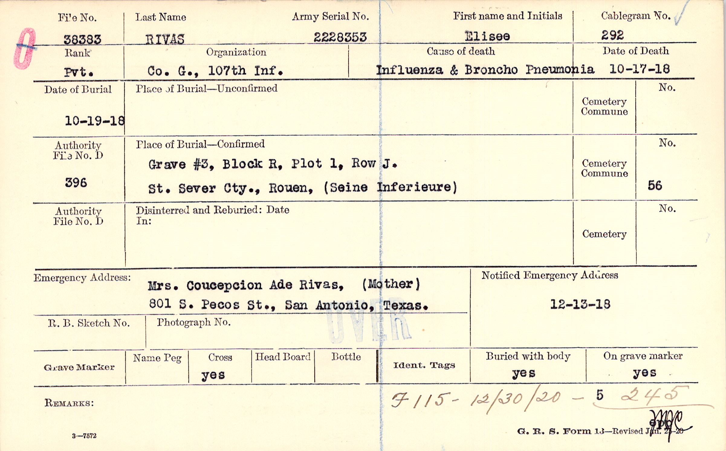 Mrs. Coucepcion Ade Rivas, (Mother), 801 S. Pecos St., San Antonio, Texas.