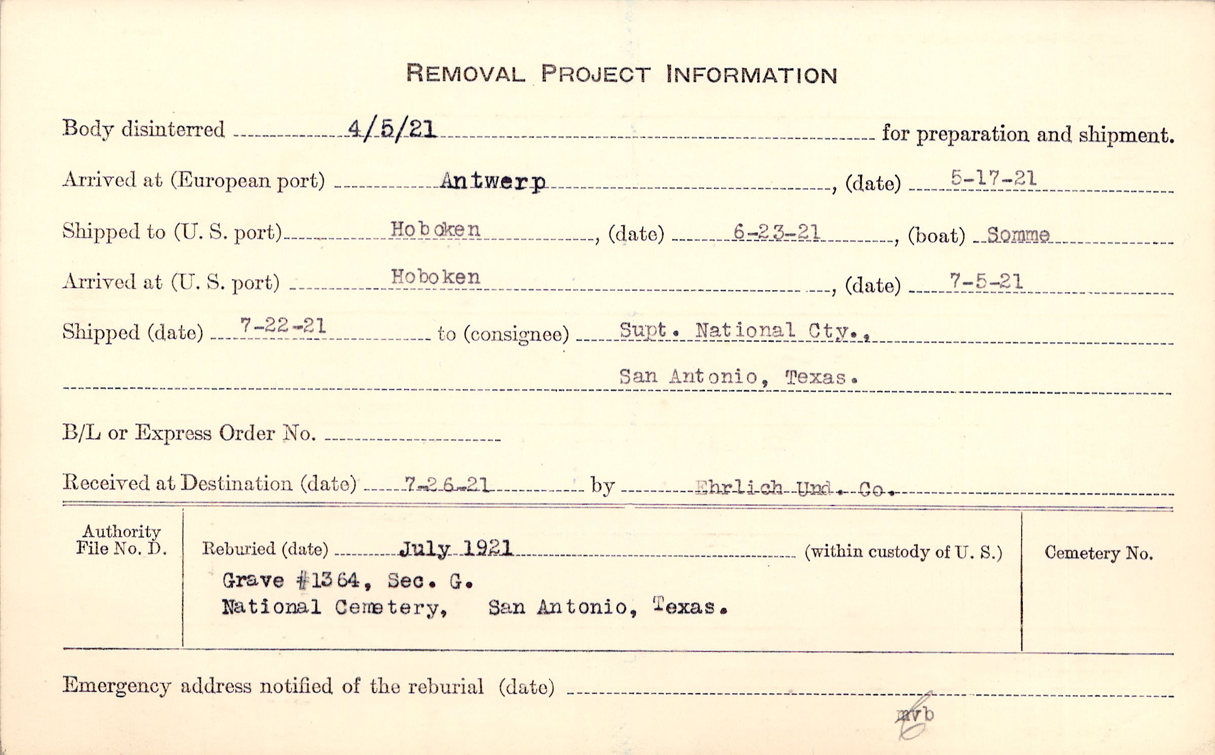 Body disinterred 4/5/1921 for preparation and shipment.