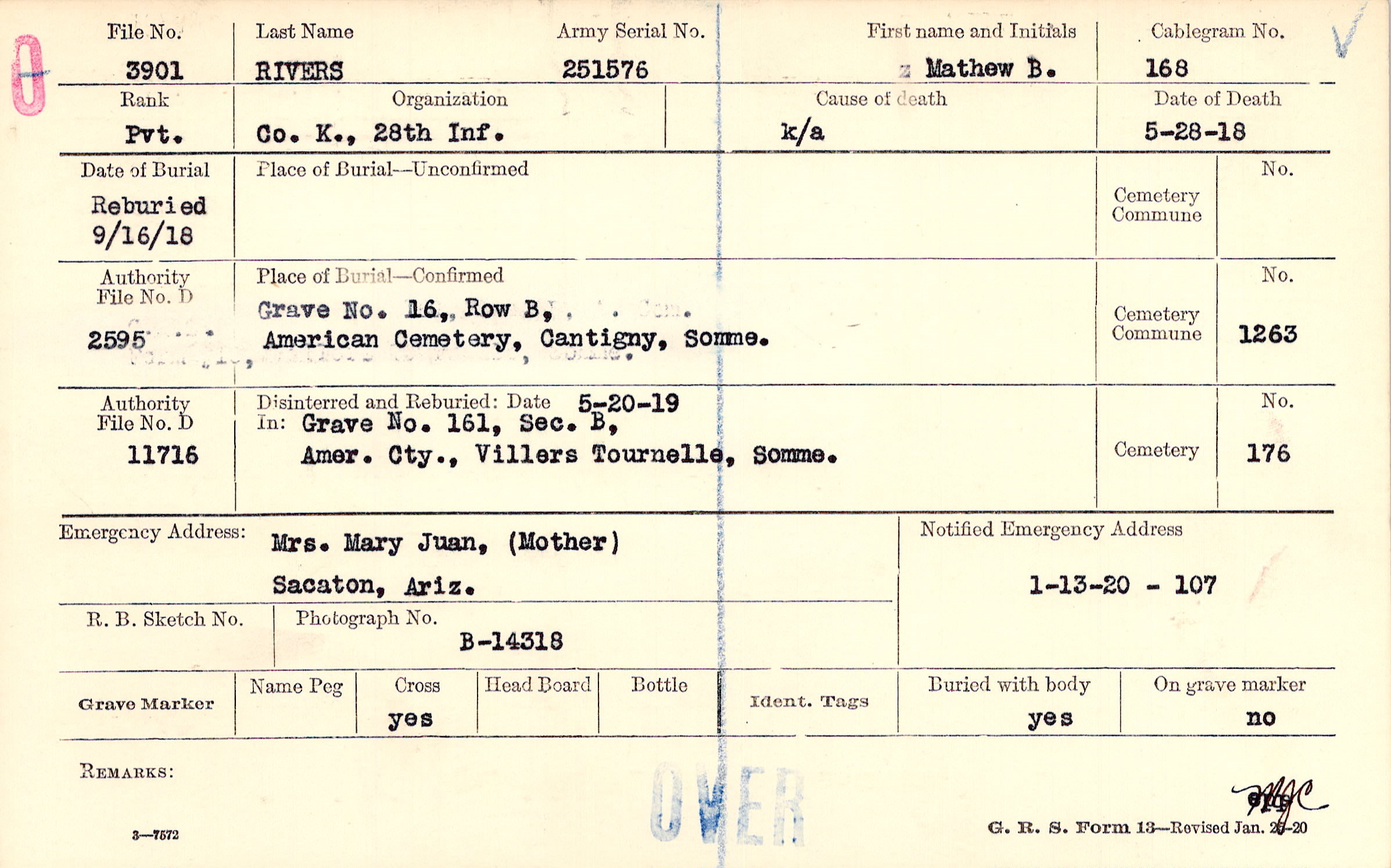 Grave 16, Row B, American Cemetery, Cantigny, Somme.