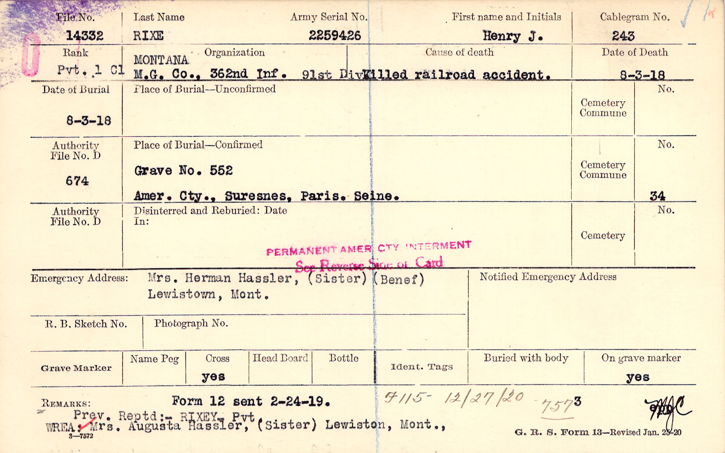 Prev. Reptd:- RIXEY, Pvt. WREA: Mrs. Augusta Hassler, (Sister) Lewiston, Mont.,, Form 12 sent 2-24-19, F115- 12/27/20, 757