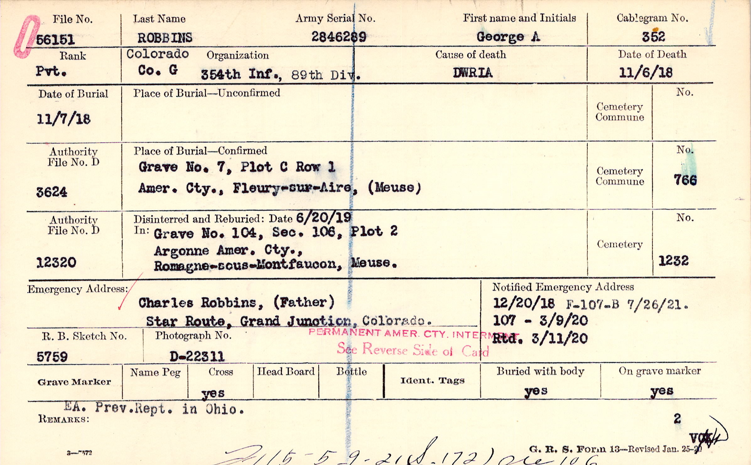 Charles Robbins, (Father), Star Route, Grand Junction, Colorado.