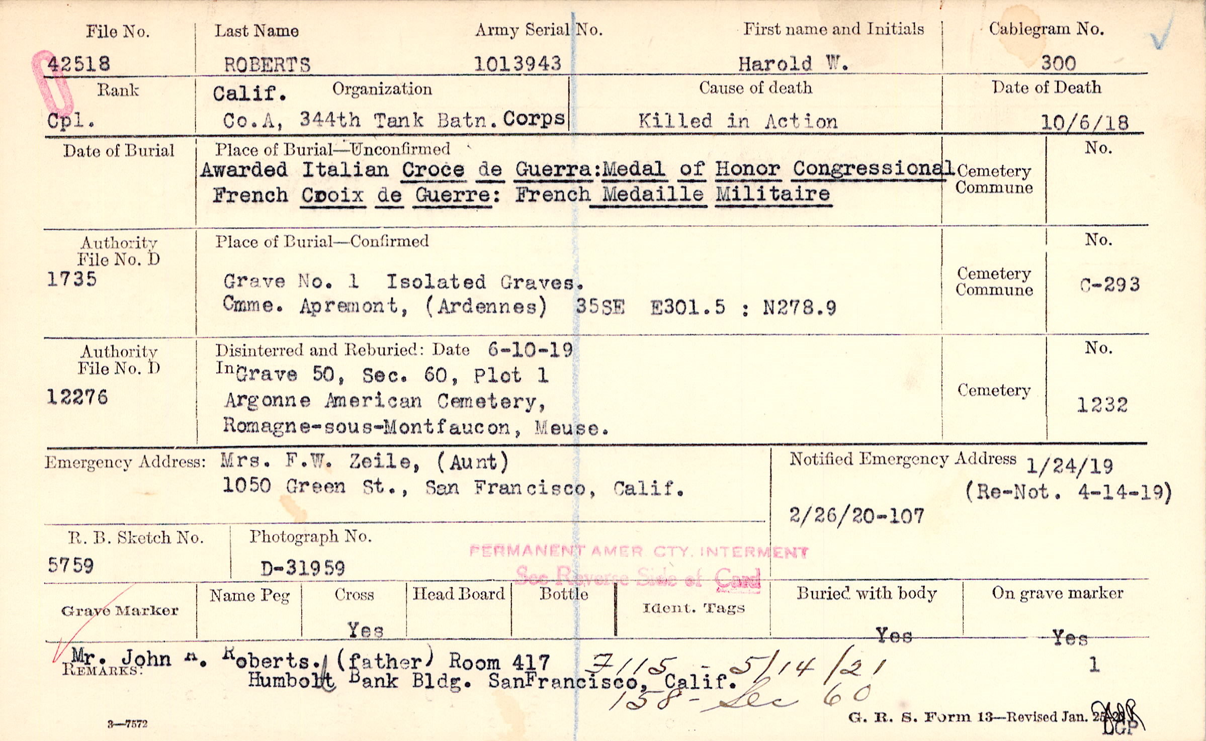 Mrs. F.W. Zeile, (Aunt), 1050 Green St., San Francisco, Calif.