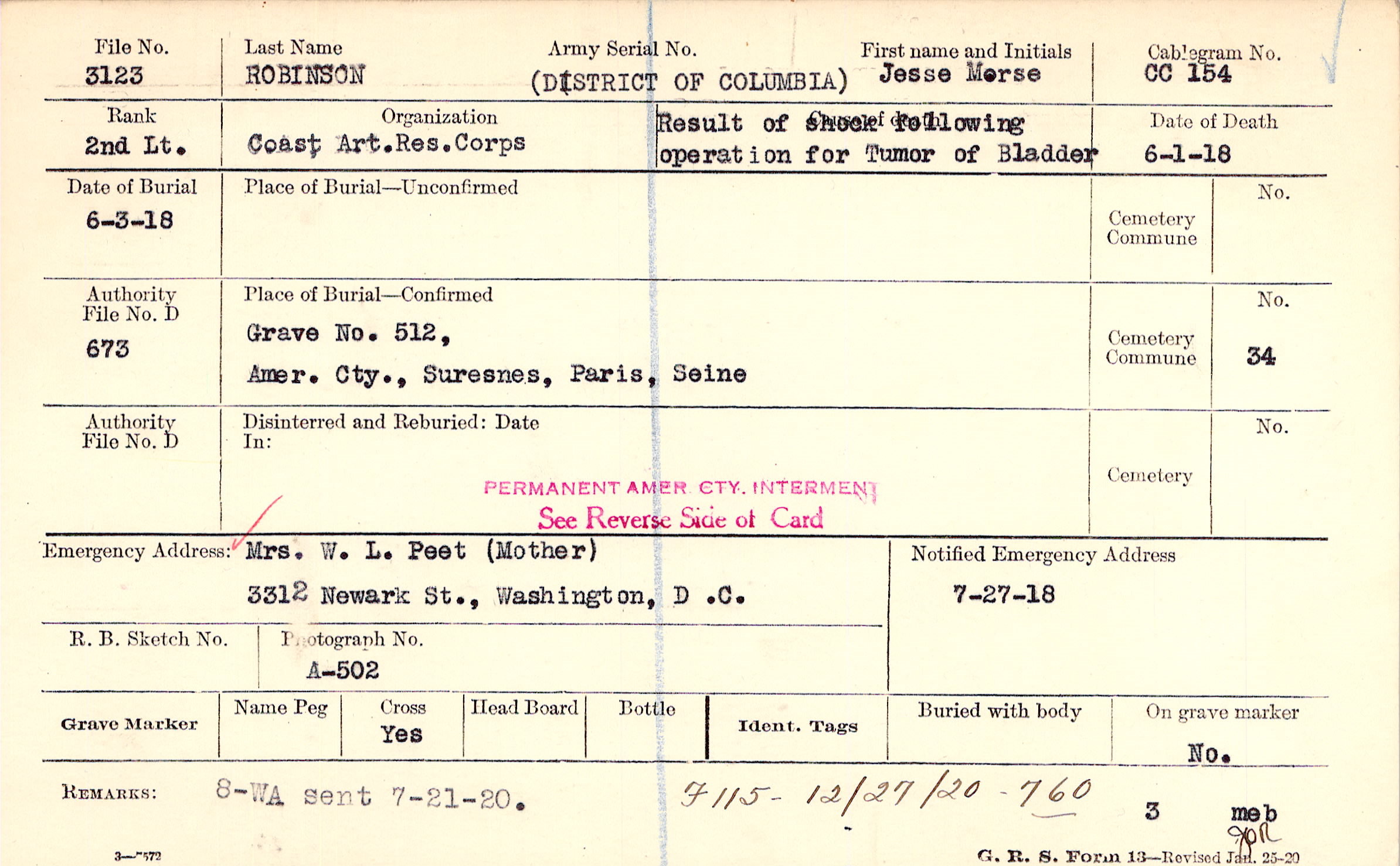 Mrs. W. L. Peet (Mother), 3312 Newark St., Washington, D. C.
