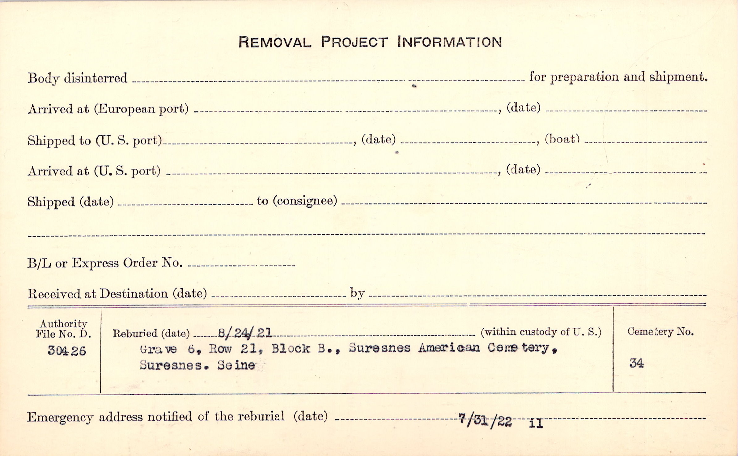 | Permanent Burial in Foreign Cemetery |