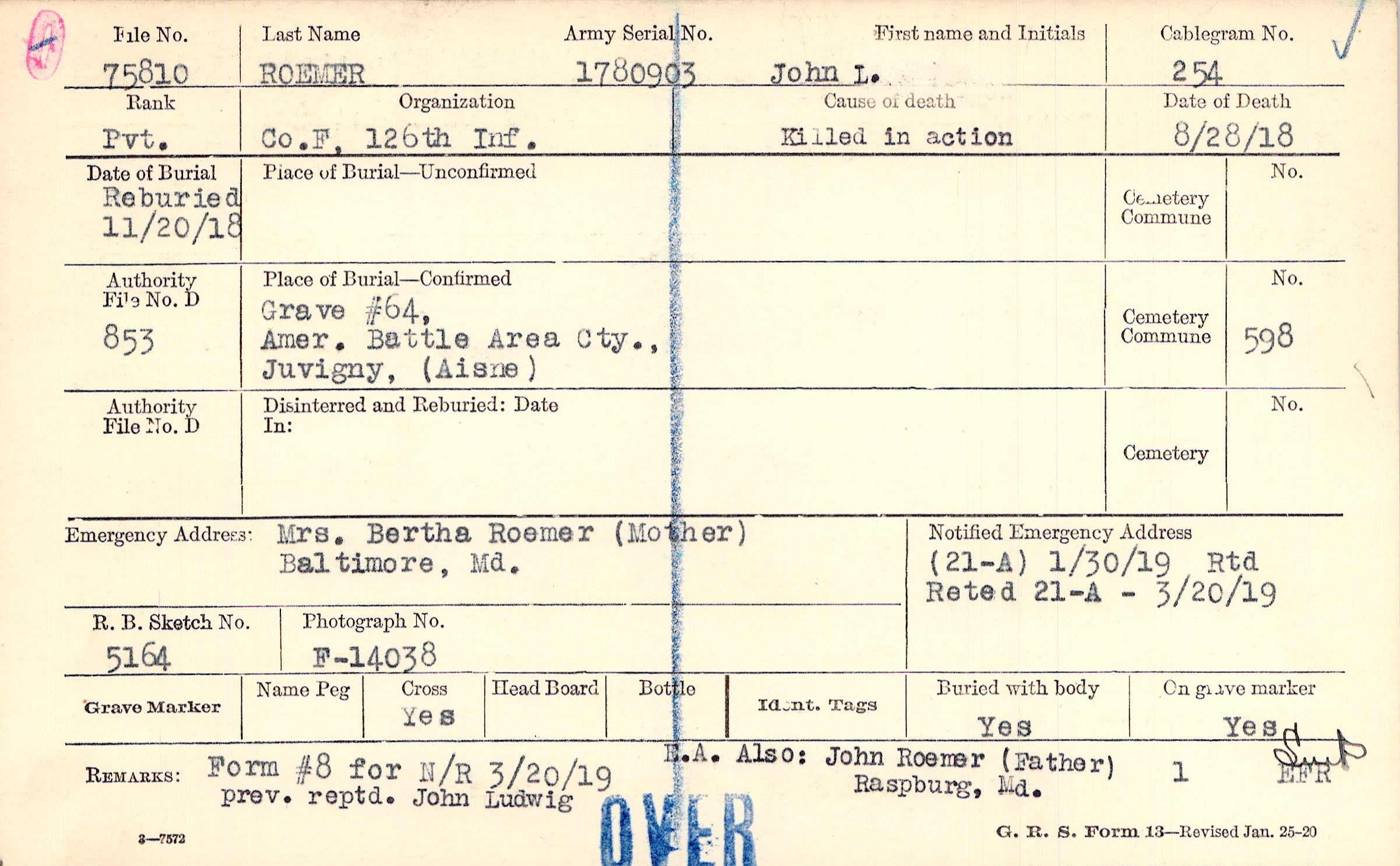 E. A. Also: John Roemer, (Father) Raspburg, Md. prev. reptd. John Ludwig, Form #8 for N/R 3/20/19
