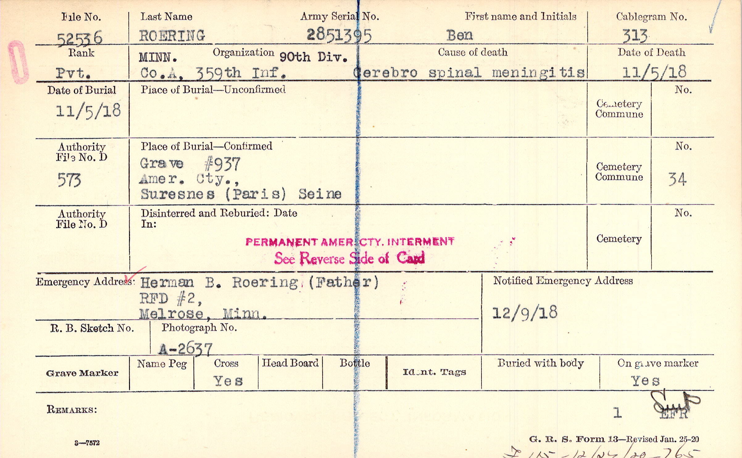 Grave #937, Amer. Cty., Suresnes, Paris, Seine