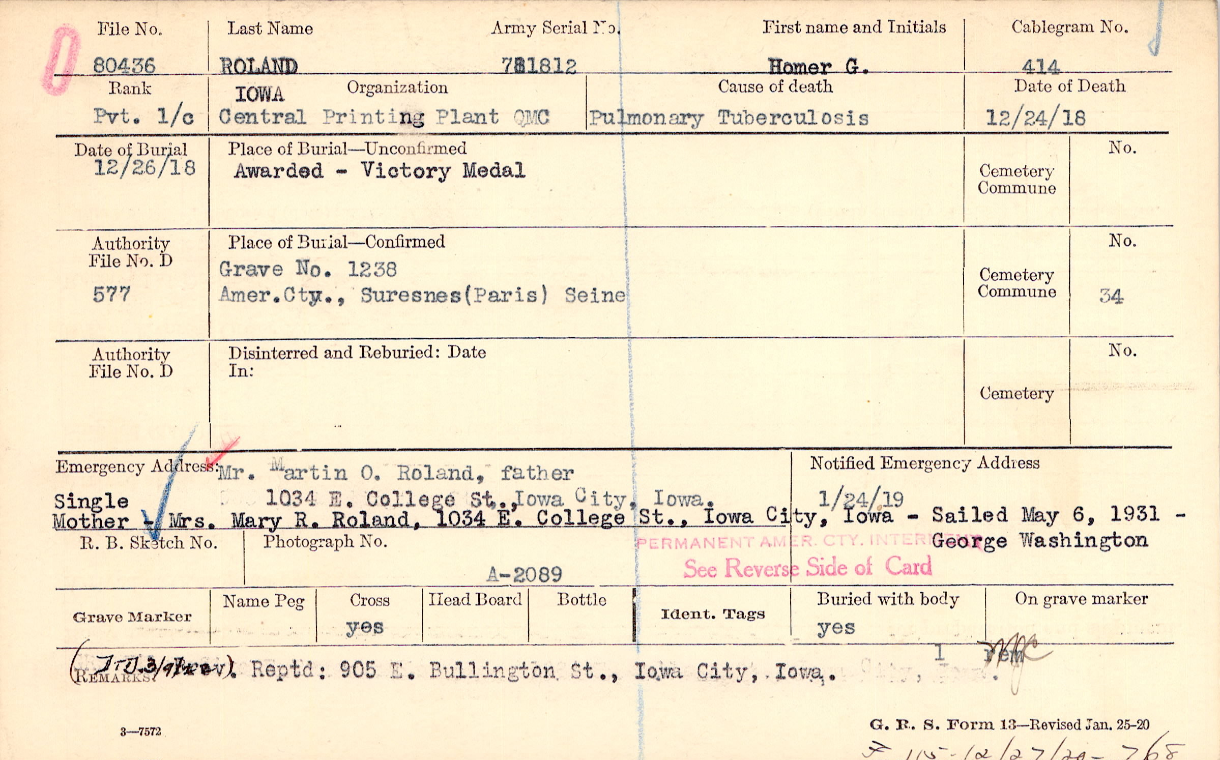 Mr. Martin O. Roland, father, 1034 E. College St., Iowa City, Iowa., Single Mother - Mrs. Mary R. Roland, 1034 E. College St., Iowa City, Iowa - Sailed May 6, 1931 - George Washington