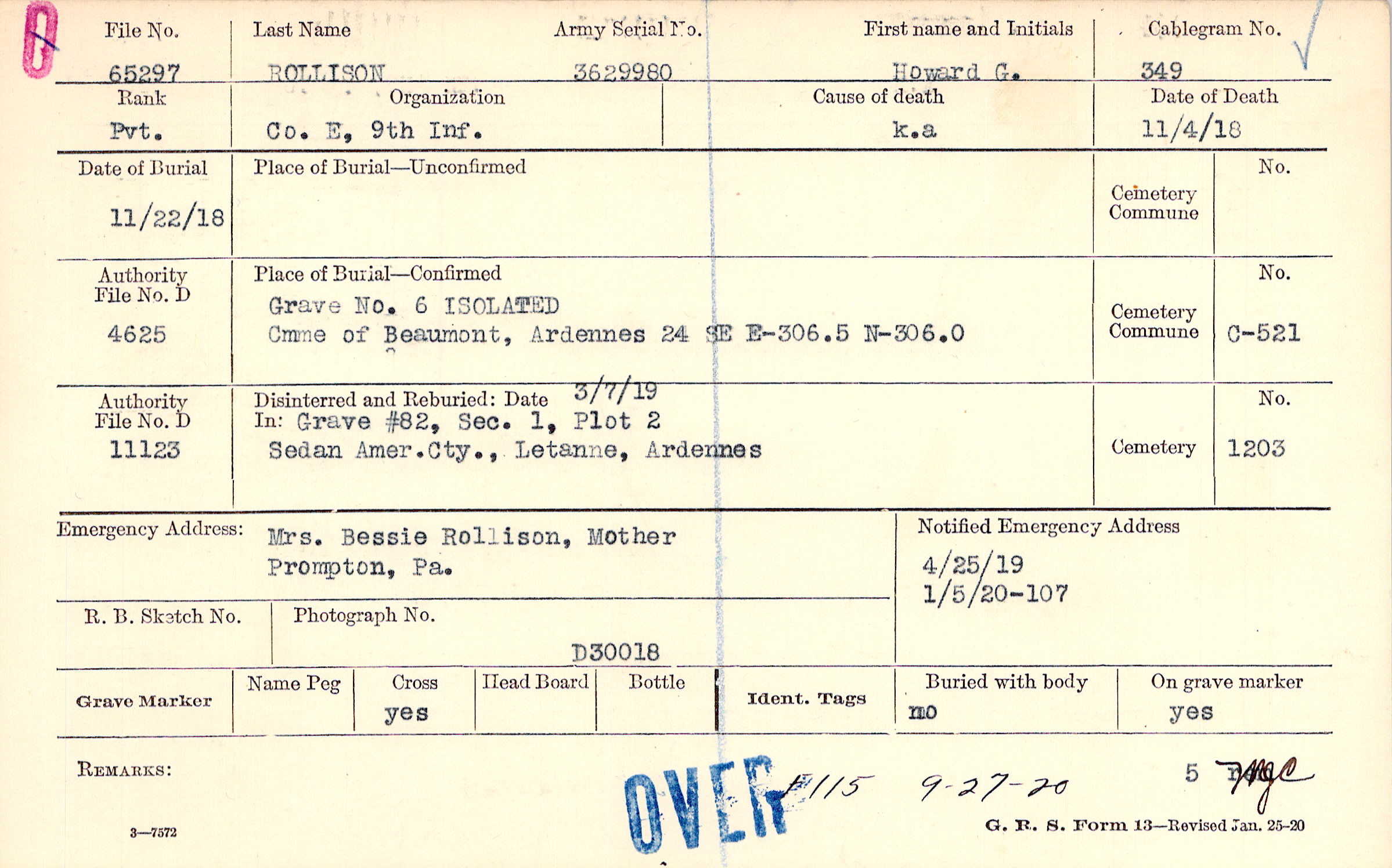 Grave 82, Section 1, Plot 2, Sedan American Cemetery, Latanne, Ardennes