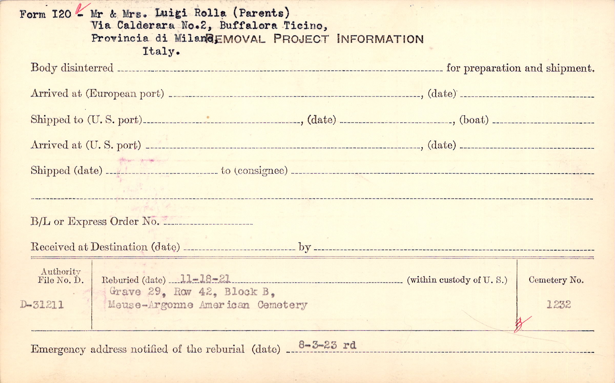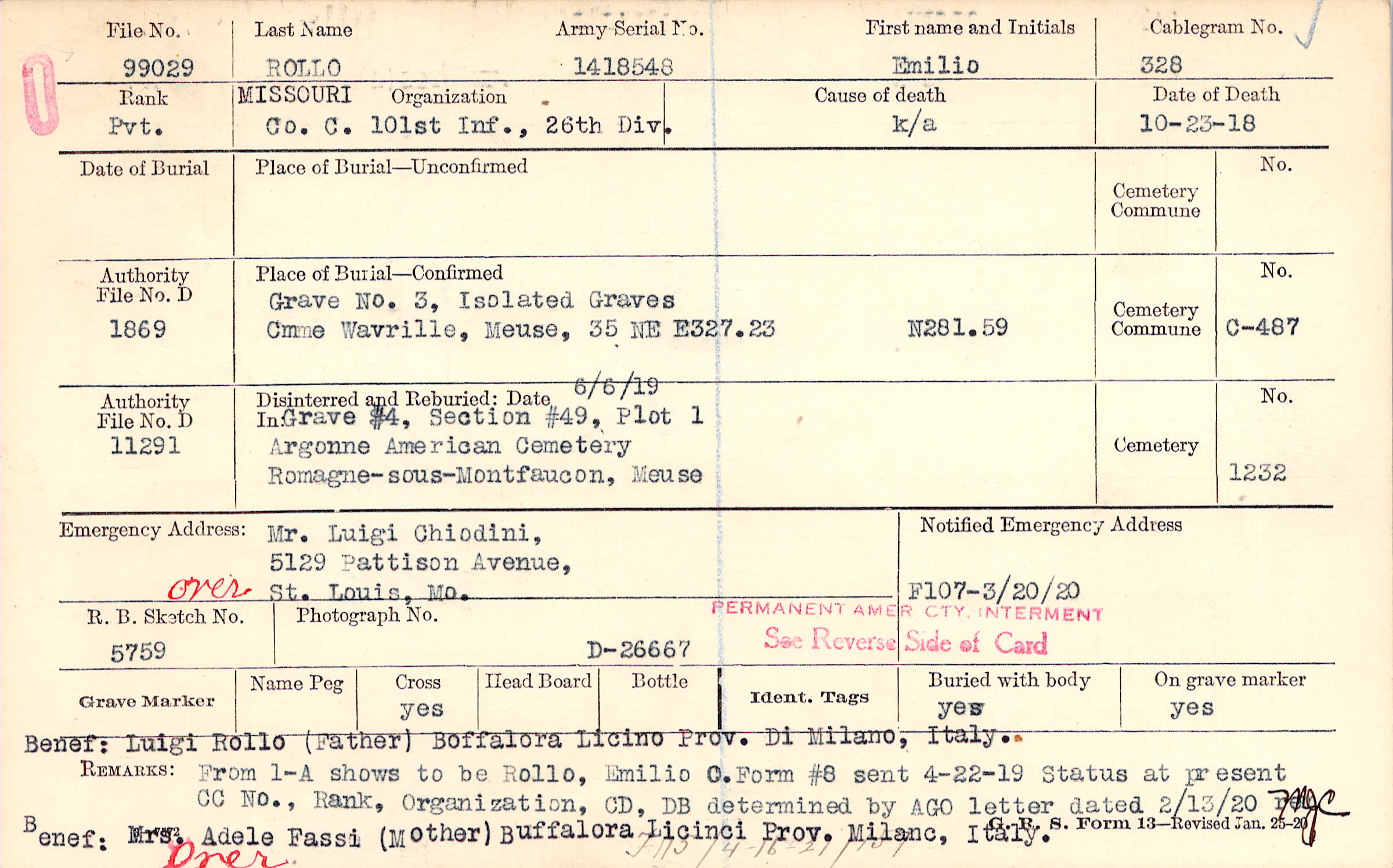 Benef: Luigi Rollo (Father) Boffalora Licino Prov. Di Milano, Italy. From 1-A shows to be Rollo, Emilio C. Status at present CC No., Rank, Organization, CD, DB determined by AGO letter dated 2/13/20 Benef: Mrs. Adele Fassi (Mother) Bullalora Licinci Prov. Milano, Italy. Over, Form #8 sent 4-22-19., F115 / 4-16-21 / 157(?)