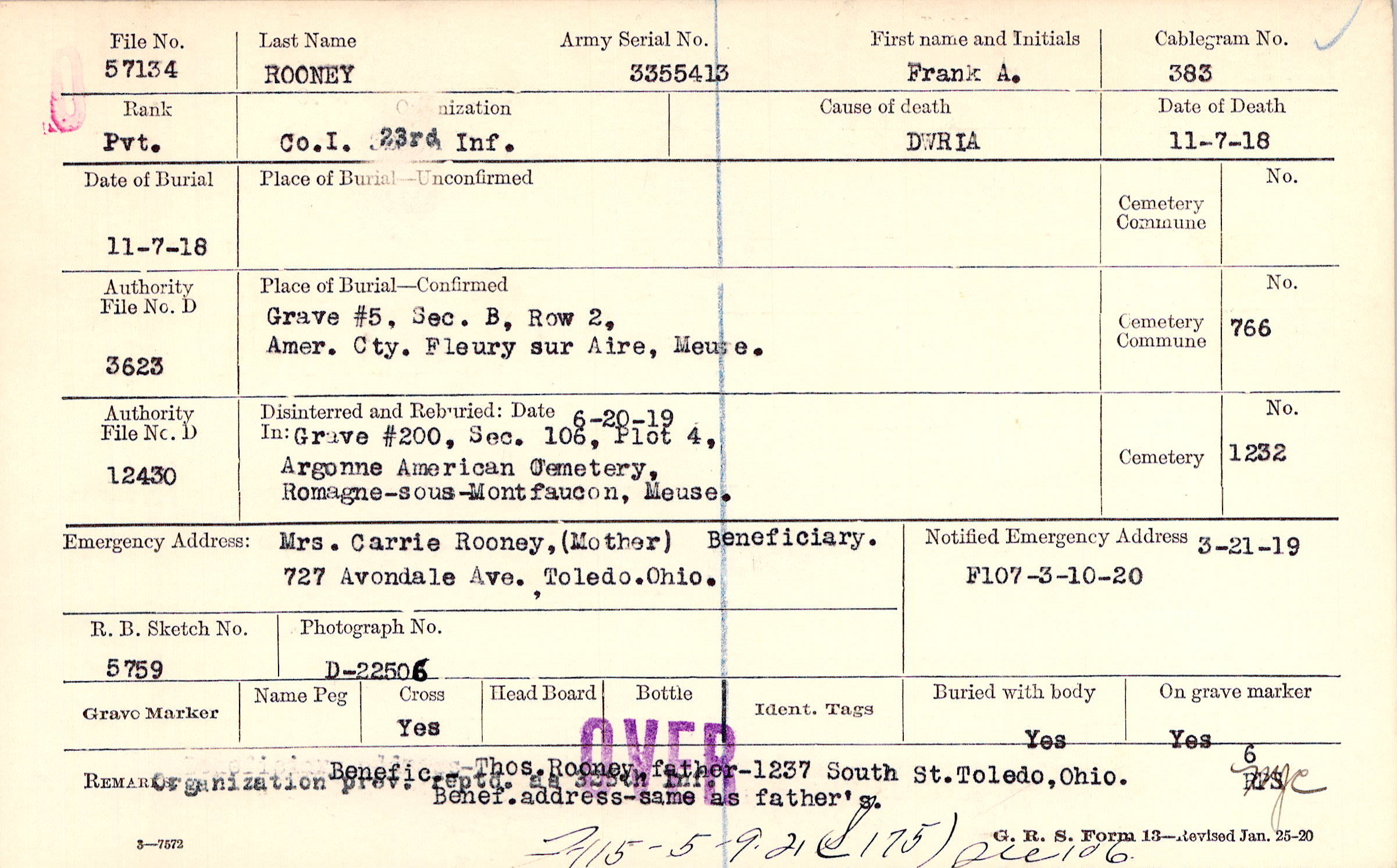 Benefic. - Thos. Rooney, father - 1237 South St. Toledo, Ohio Organization prev. reptd. as 325th Inf. Benef. address - same as father's
