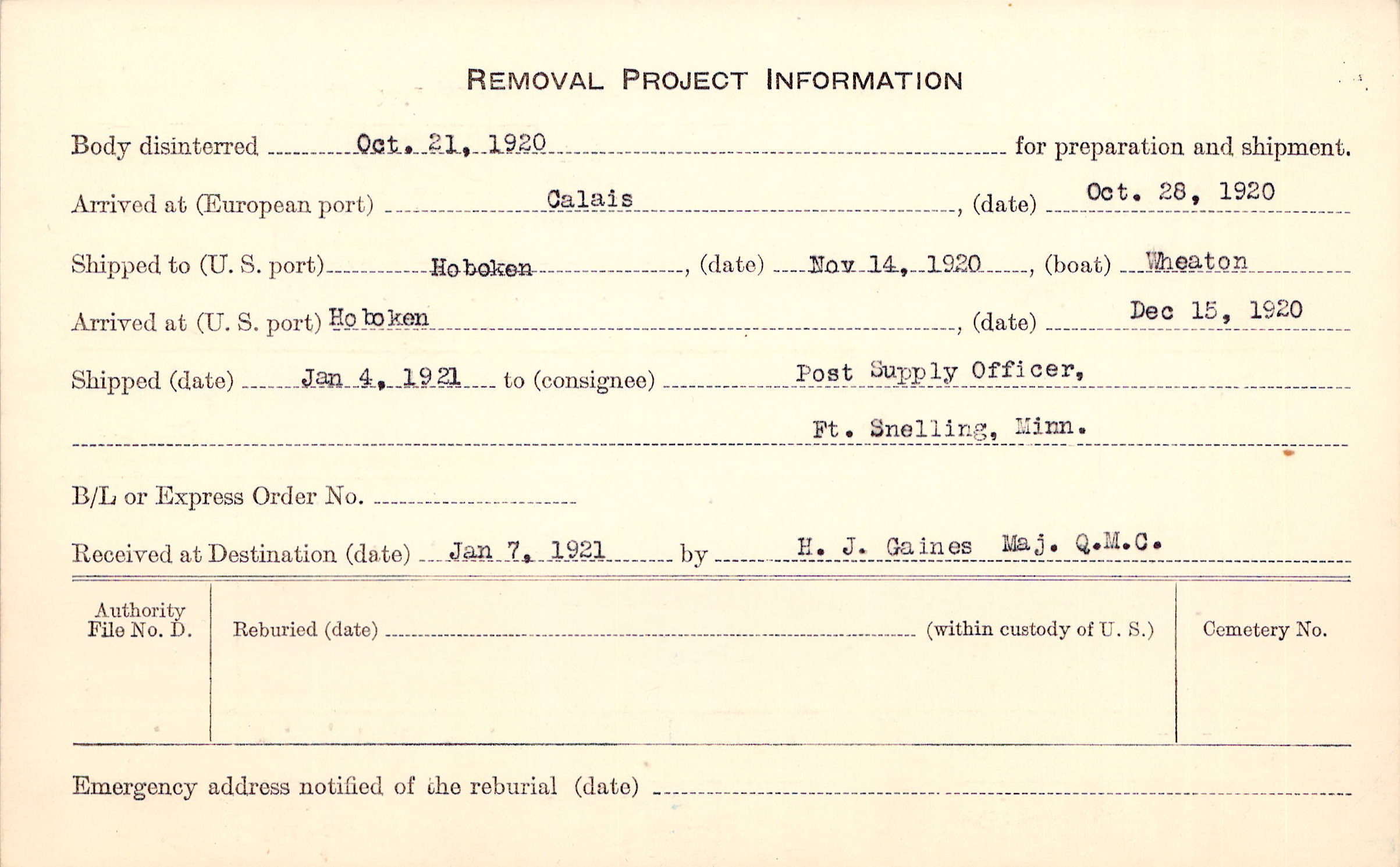 Body disinterred 10/21/1920 for preparation and shipment.