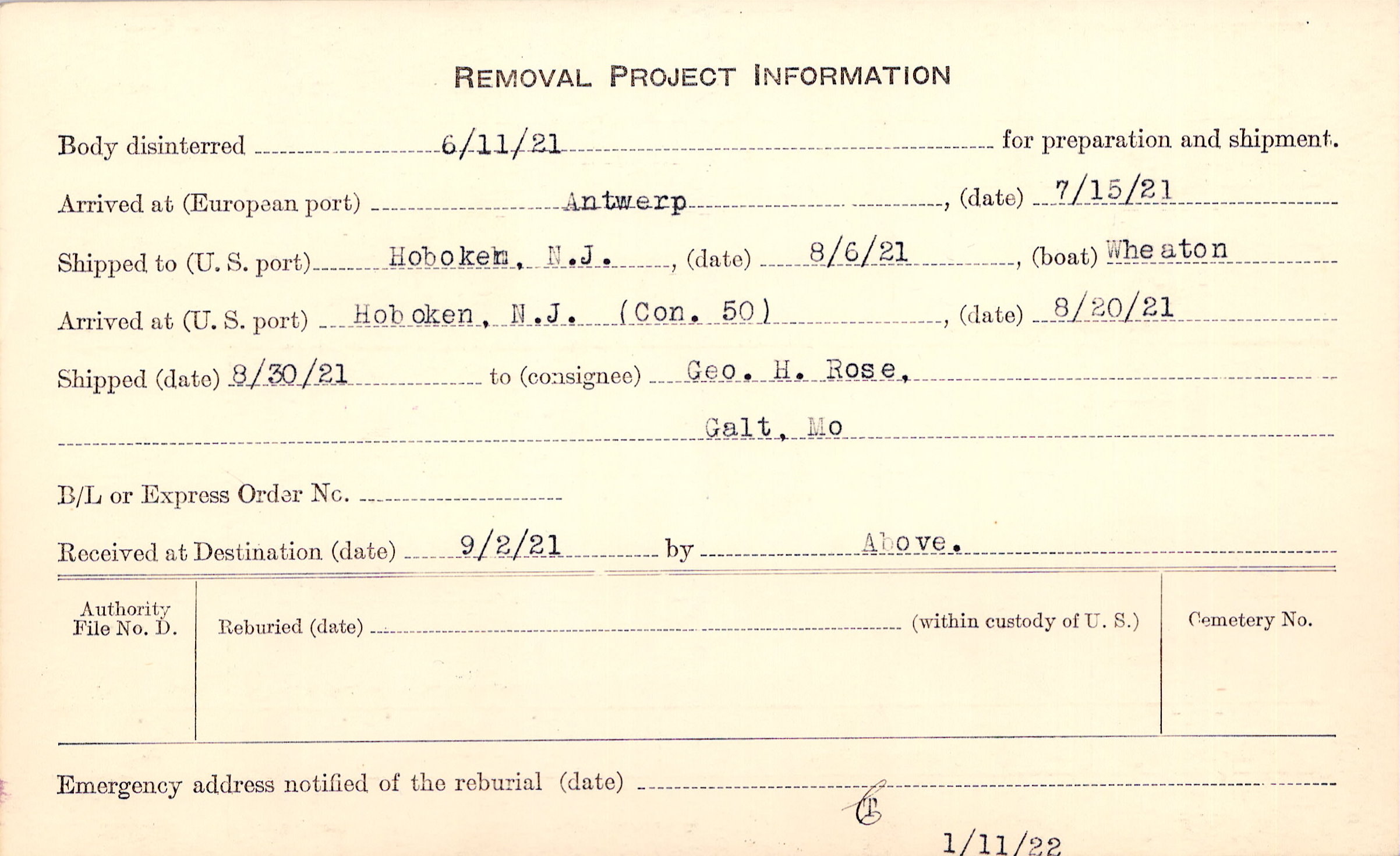 Body disinterred 6/11/1921 for preparation and shipment.