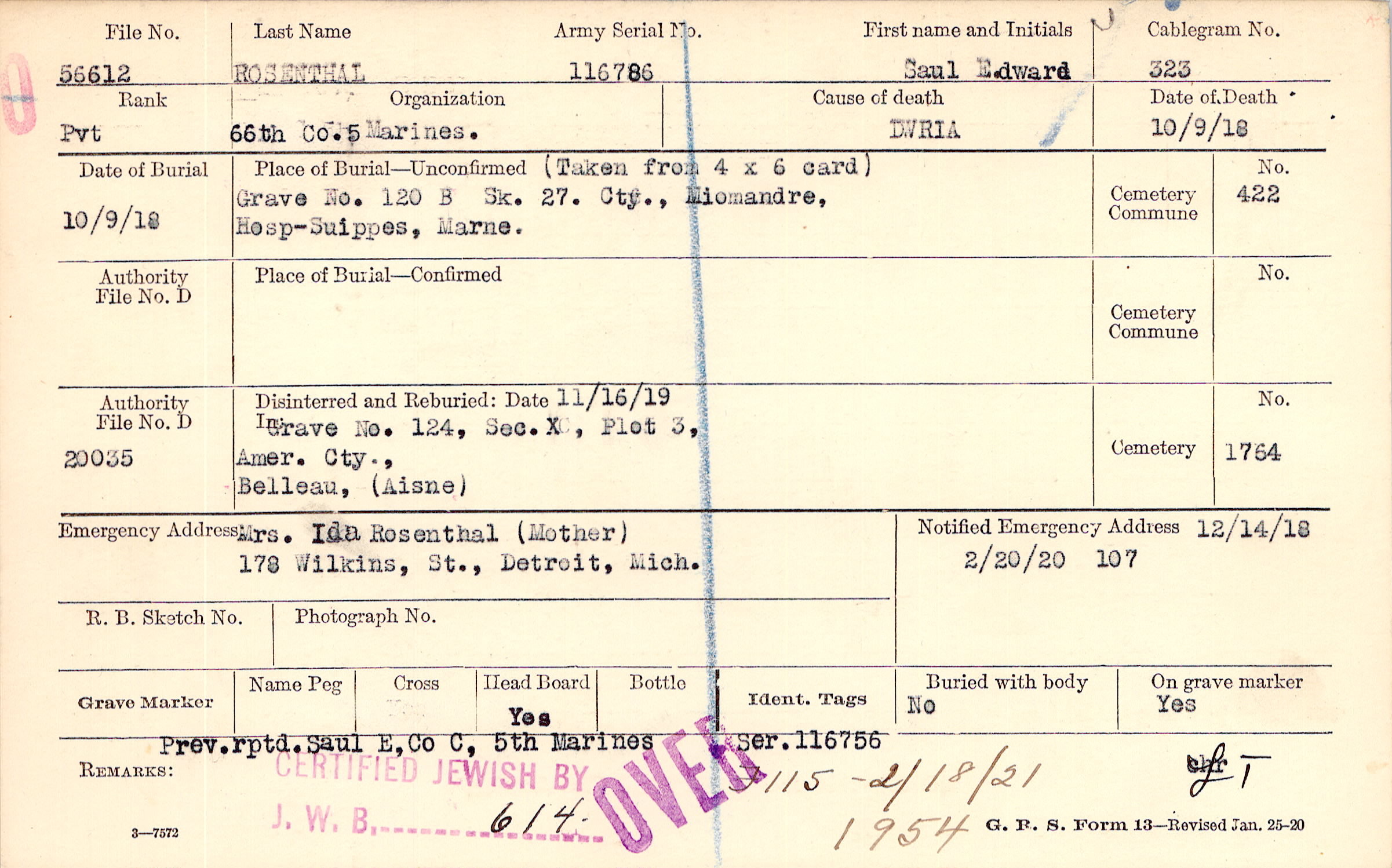 Prev. rpted. Saul E, Co C, 5th Marines Ser. 116756, F115 - 2/18/21 1954