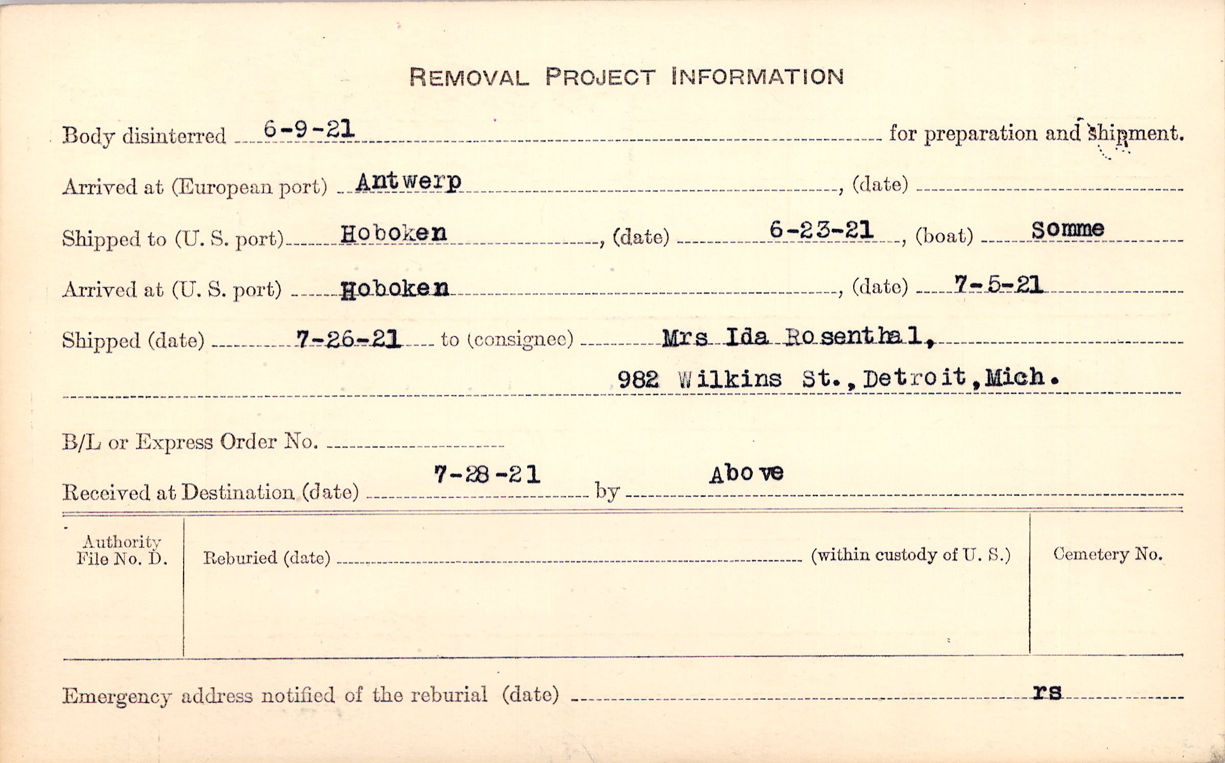 Body disinterred 6/9/1921 for preparation and shipment.