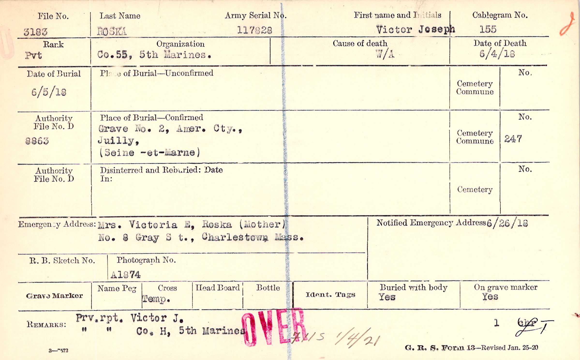 Mrs. Victoria E, Roska (Mother), No. 8 Gray S t., Charlestown Mass.