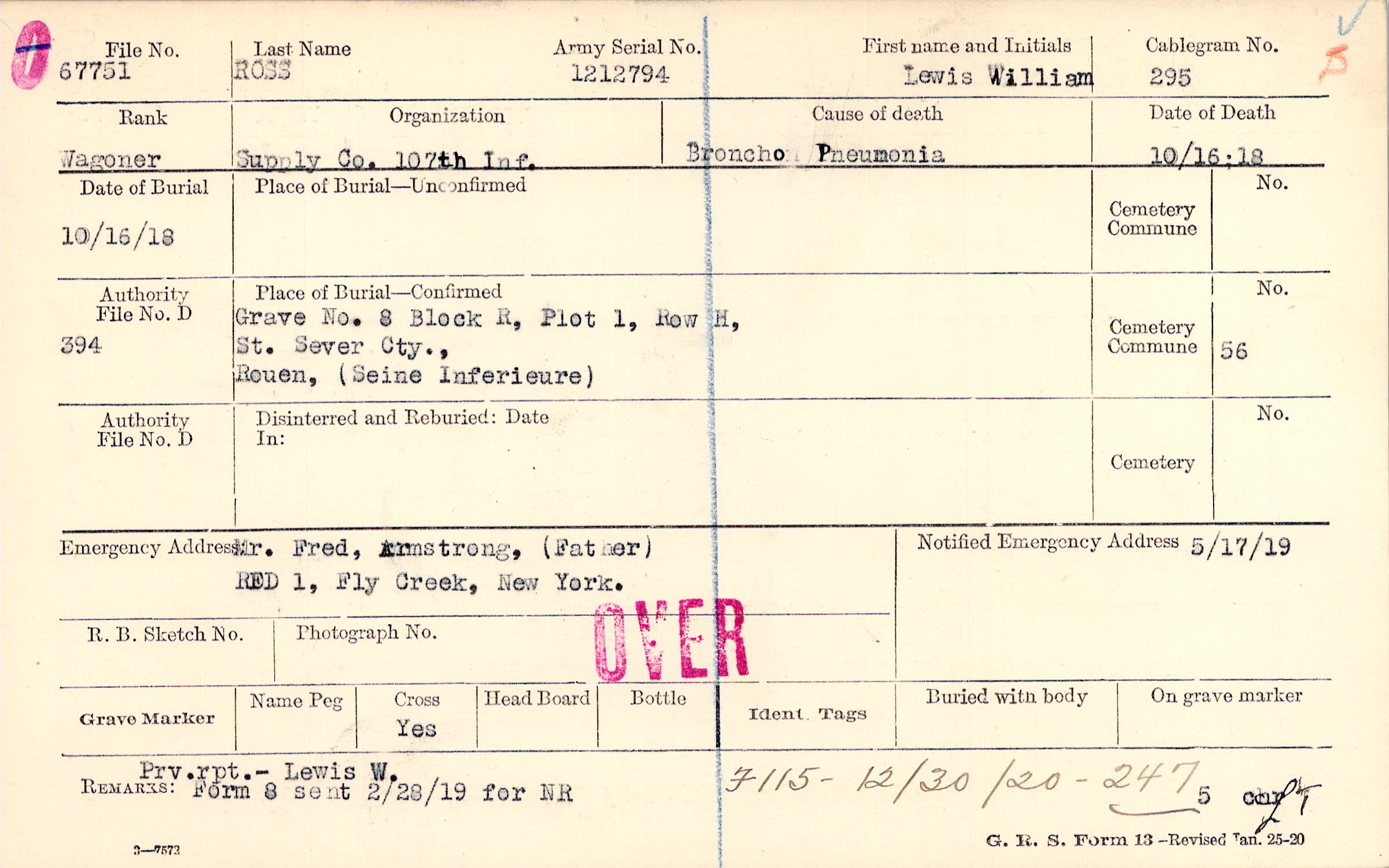 Mr. Fred Armstrong, (Father), RFD 1, Fly Creek, New York.