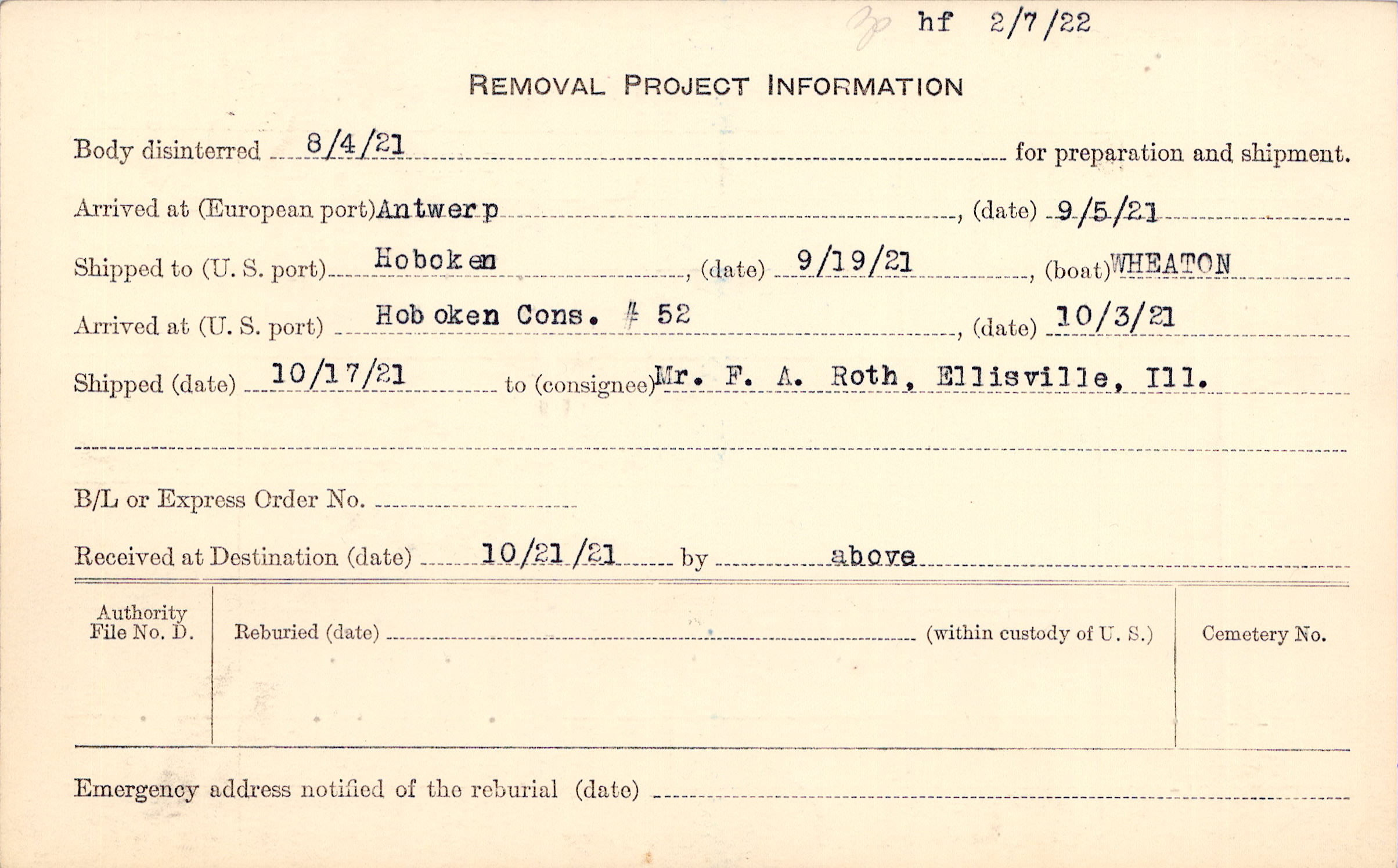 Body disinterred 8/4/1921 for preparation and shipment.