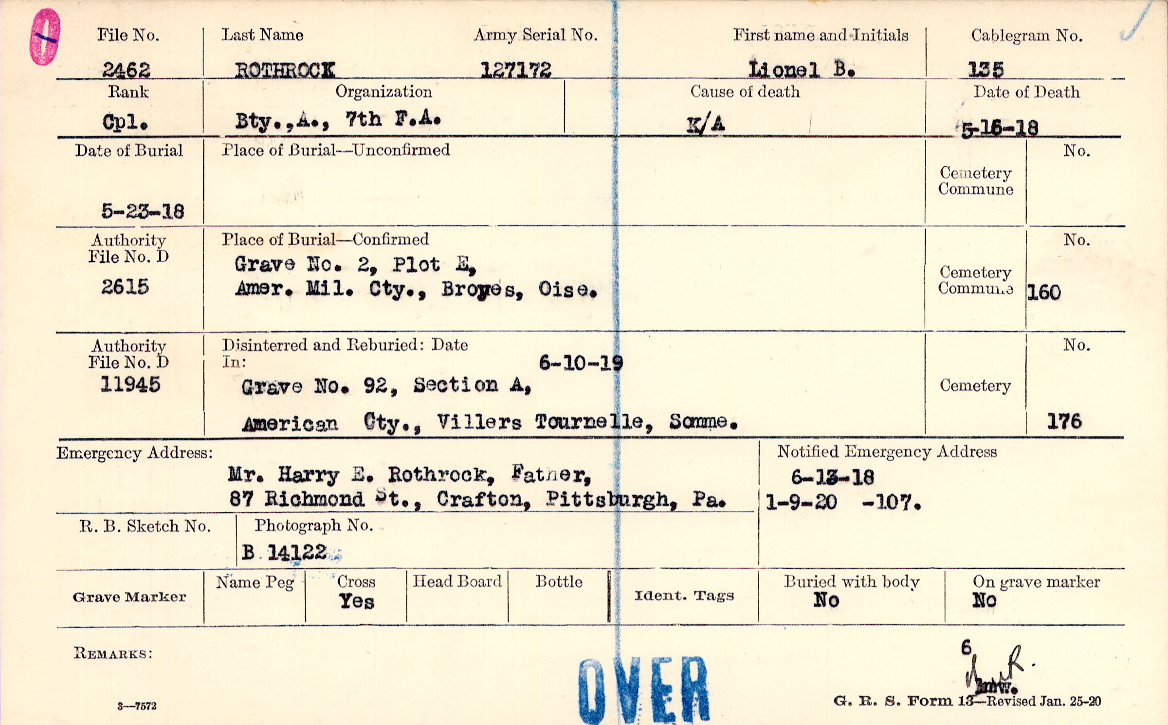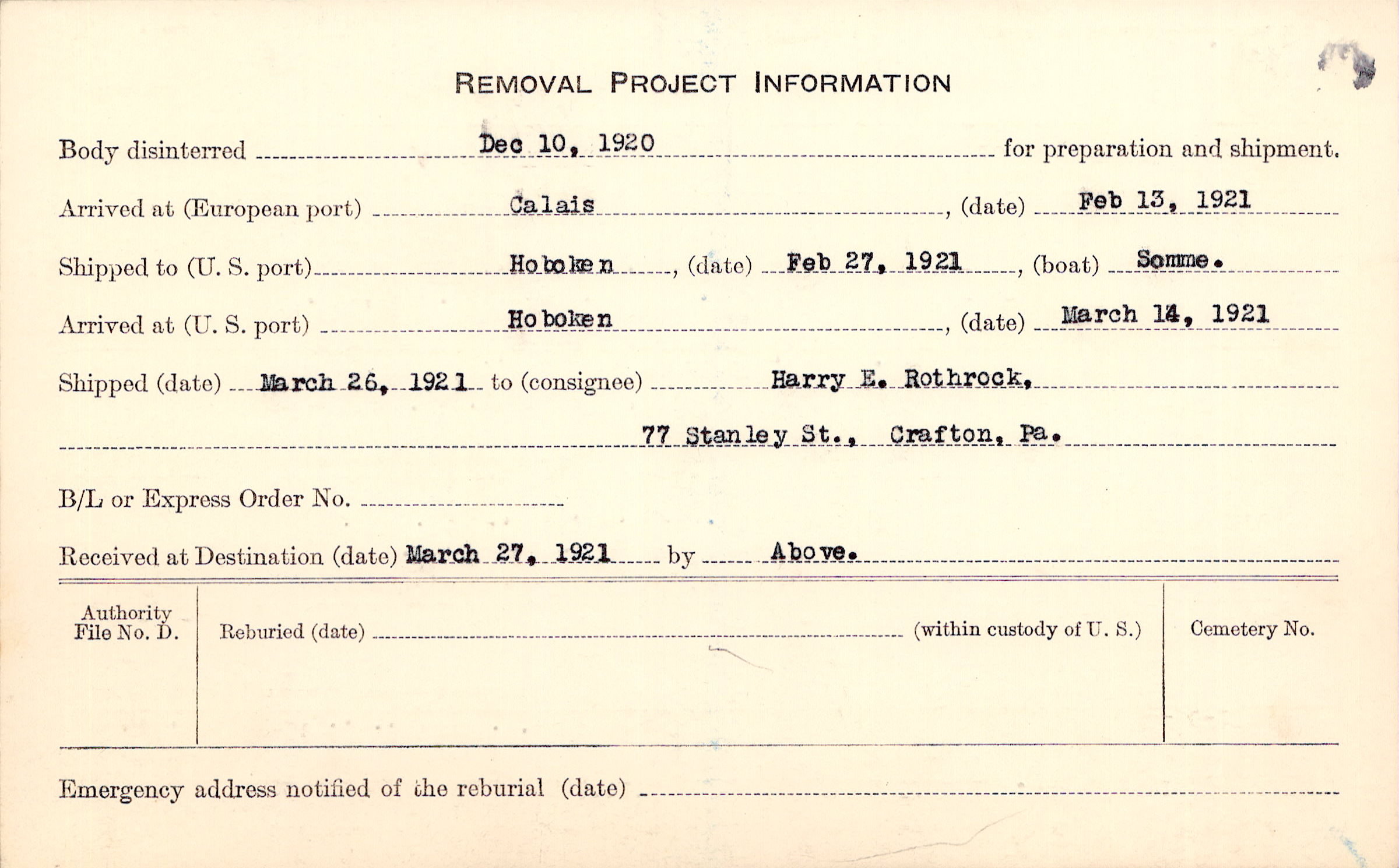Mr. Harry E. Rothrock, Father, 87 Richmond St., Crafton, Pittsburg, Pa.